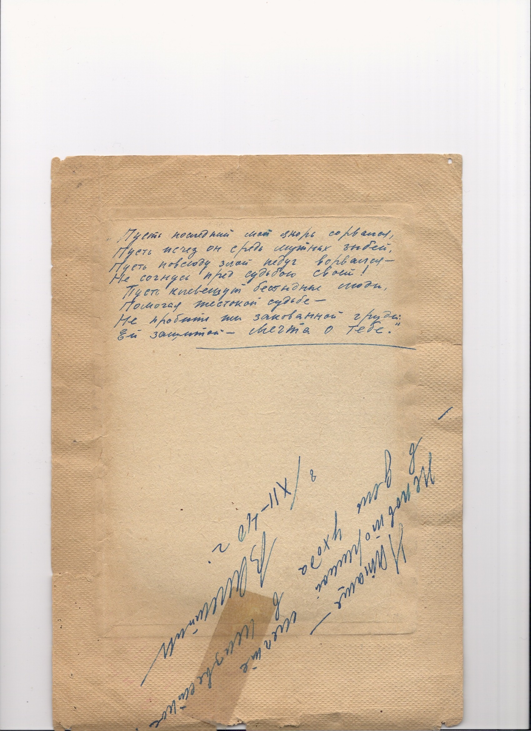 Майор В.И. Аккуратов перед уходом на Зимнюю войну. Подпись и стихи на обороте В.И. Аккуратова.