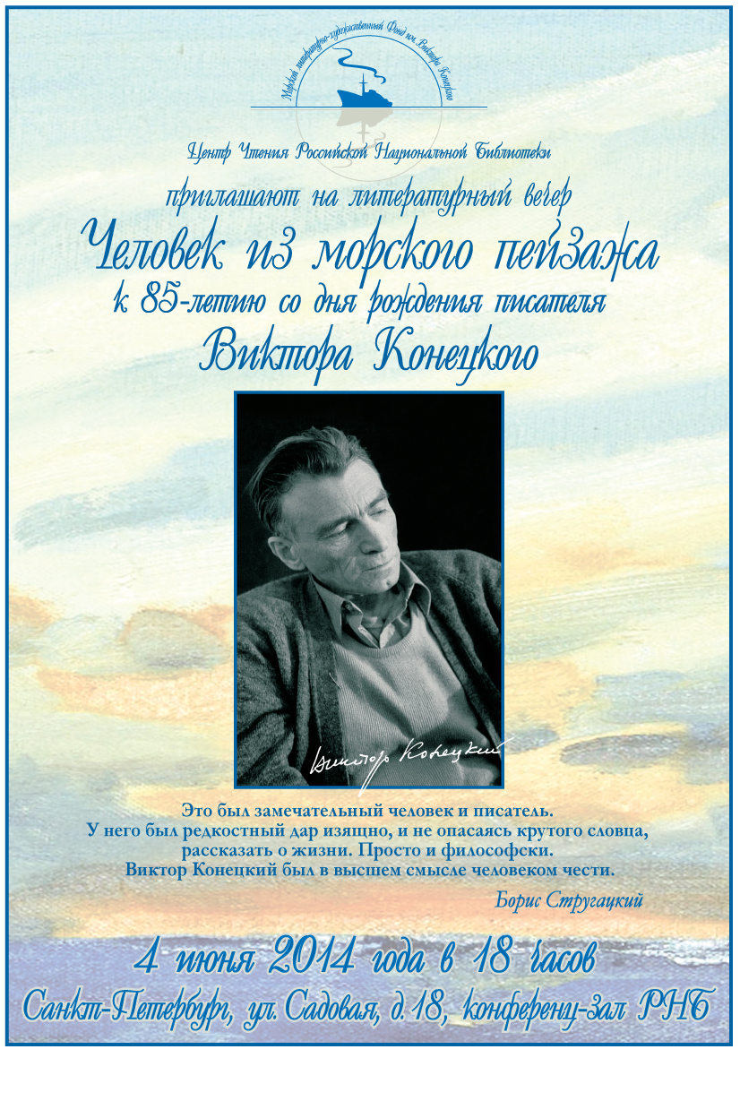 Приглашаем Вас на литературный вечер, посвящённый 85-летию со дня рождения писателя-моряка Виктора Конецкого, который состоится 4 июня в конференц-зале Российской национальной библиотеки (Санкт-Петербург, ул. Садовая, д. 18) в 18.00.