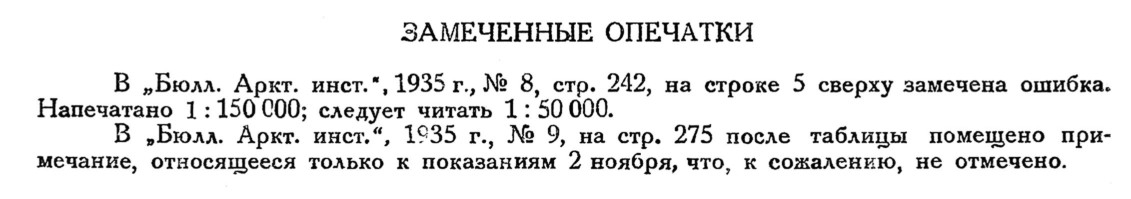 В „Бюлл. Аркт. инст. ", 1935 г., № 8, стр. 242, на строке 5 сверху замечена ошибка. Напечатано 1:150 000; следует читать 1:50 000.