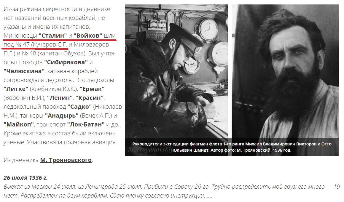 Я встречался с Алексеем Трояновским. В его публикации довольно много ошибок. Он называет руководителем экспедиции Викторова. Но тот не принимал в ней участие, а как командующий ТОФ встречал ее на Дальнем Востоке. Как известно руководителем был Евдокимов. На фото, которое вы транслируете с сайта ЦСДФ с моряком в фуражке не Викторов. Это обозначено на фотографиях, хранящихся в ГА РФ. Я сейчас не помню, кто это. На днях поеду копировать фото - уточню. В списке участников нет Кучерова С.Г. да и фото Кучерова, которые есть в ГА РФ говорят о том, что он не был военным моряком - краб с эмблемой ГУСМП.