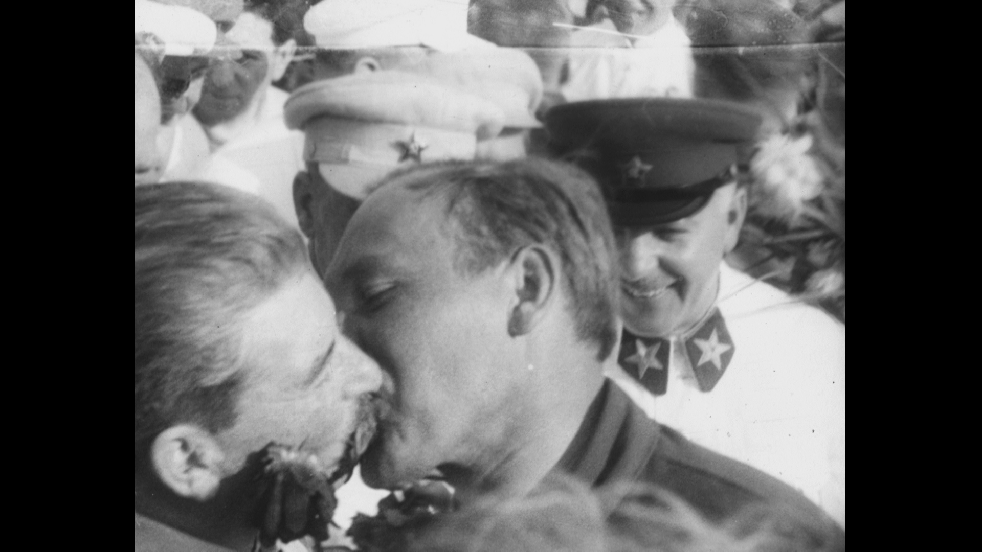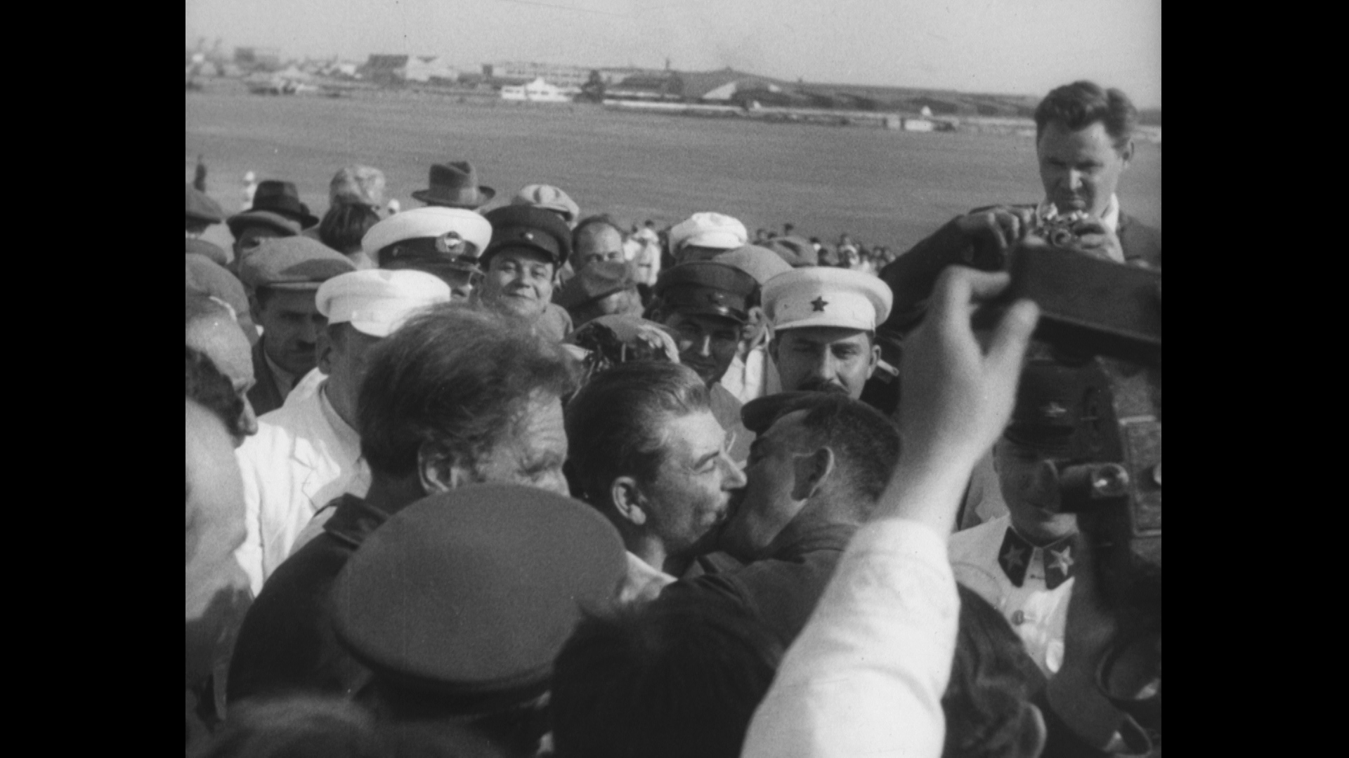 А это кадры из фильма о СП-1. В Москве встречают летчиков, высаживавших папанинцев. Поцелуй вождя!
