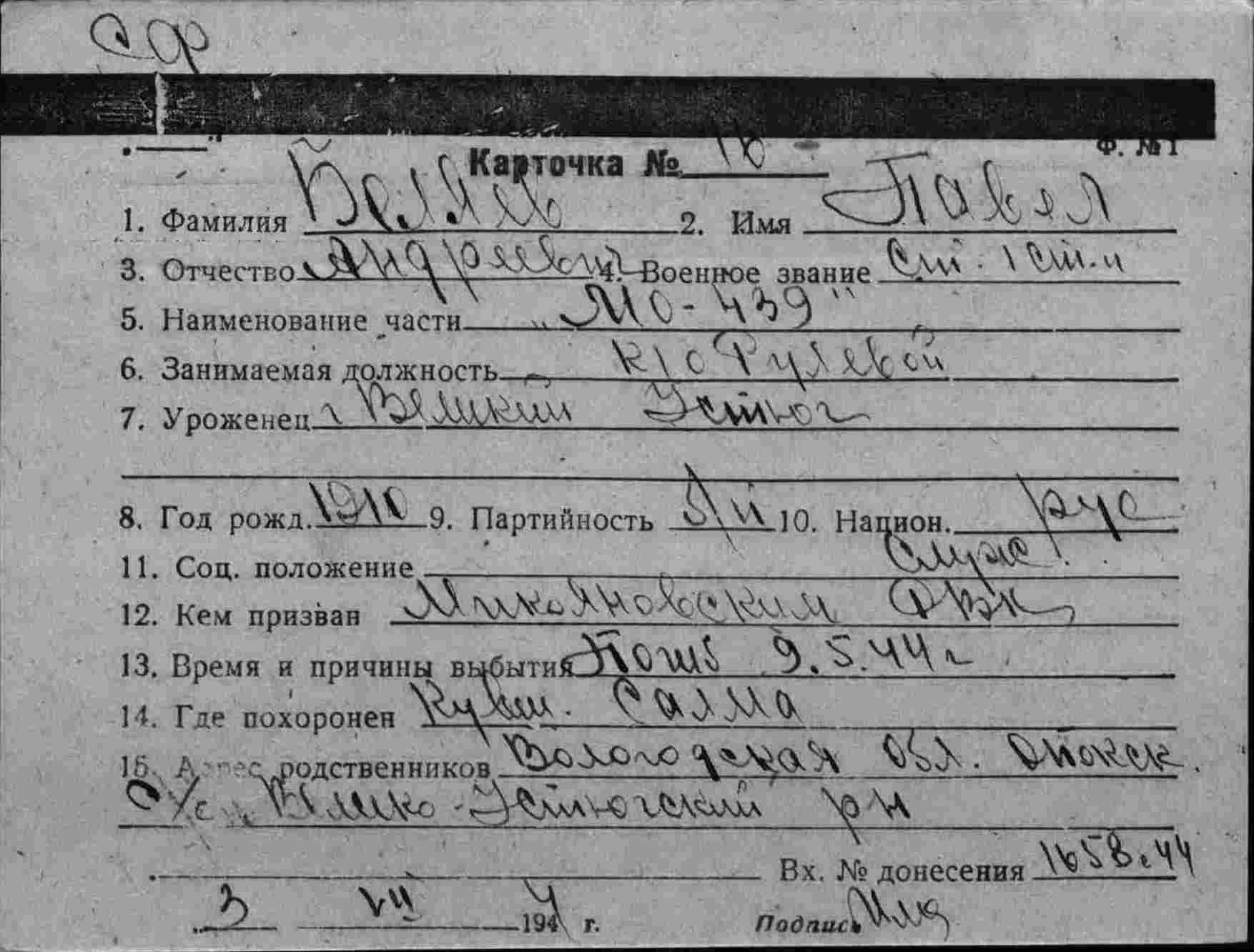 Погиб 9 мая 1944 г. на МО-439 в Кувшинской Салме