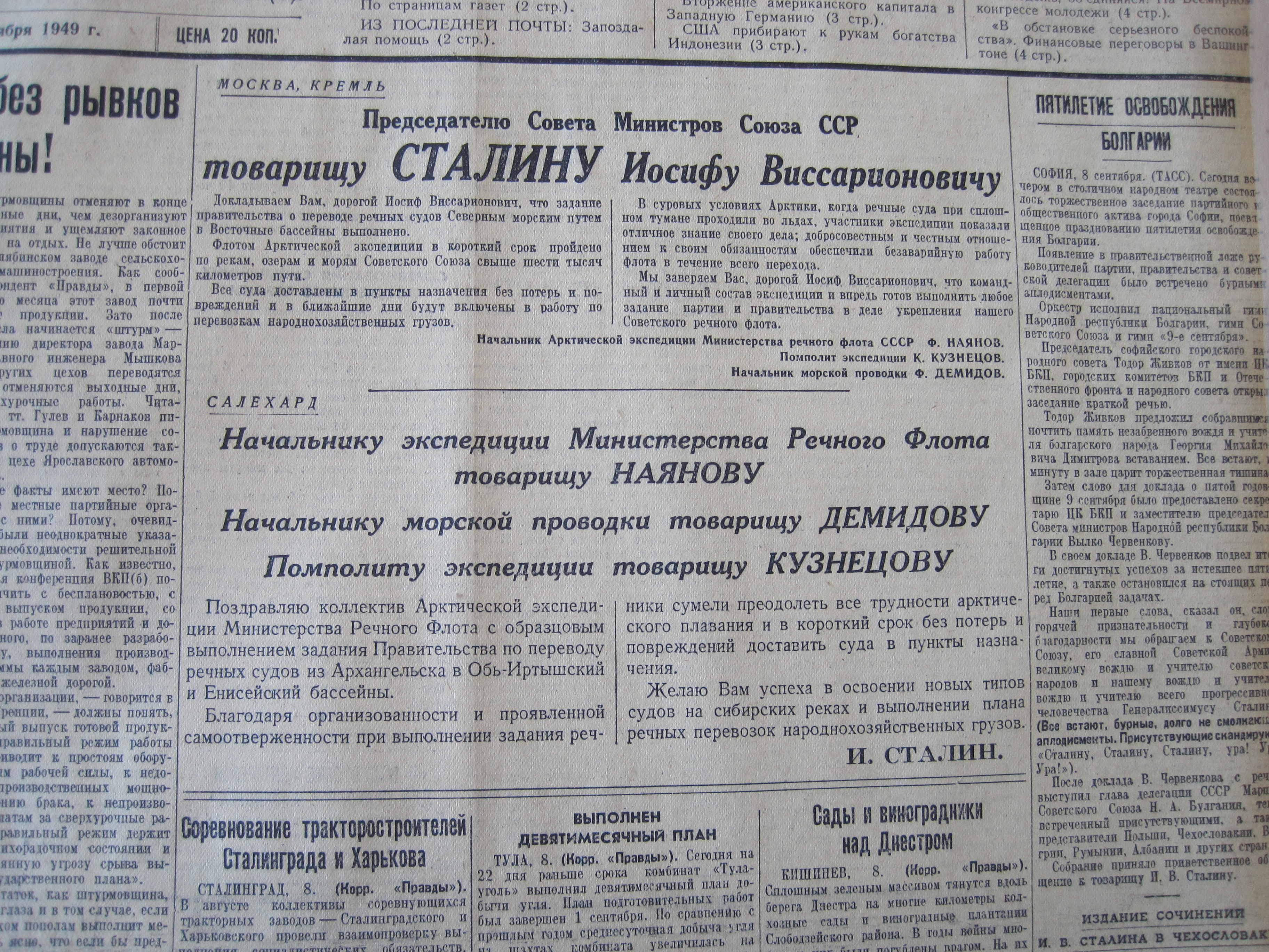 Поздравляю коллектив Арктической экспедиции Министерства речного флота с образцовым выполнением задания Правительства по переводу речных судов из Архангельска в Обь-Иртышский и Енисейский бассейны.
