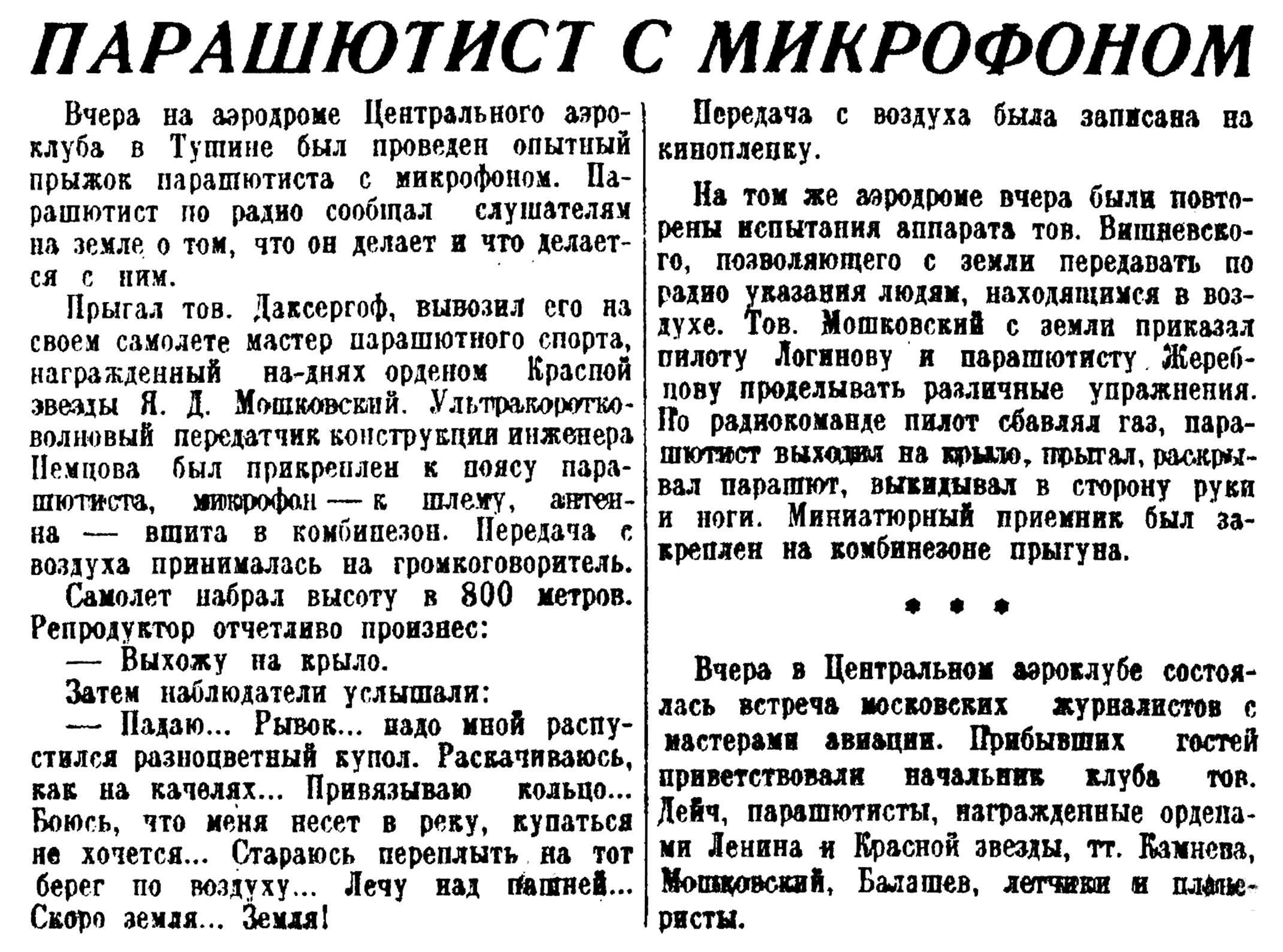 спорта И. Даксергоф говорил в микрофон все то время, которое занял у него прыжок с крыла самолета У-2 на высоте 800 метров до самой земли... Спуск продолжался 5 минут...".