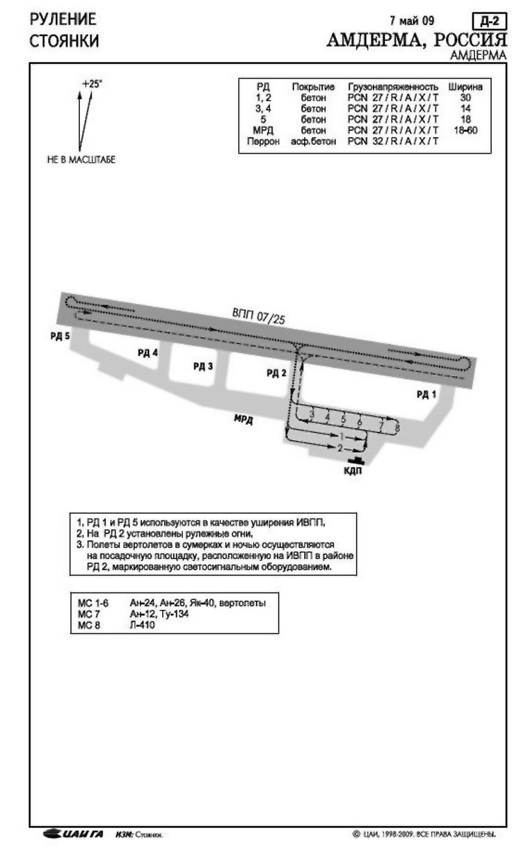 Аэродром Амдерма 2 класса, способен принимать самолёты Ил-76, Ту-134 и все более лёгкие, а также вертолёты всех типов. Максимальный взлётный вес воздушного судна 200 тонн.