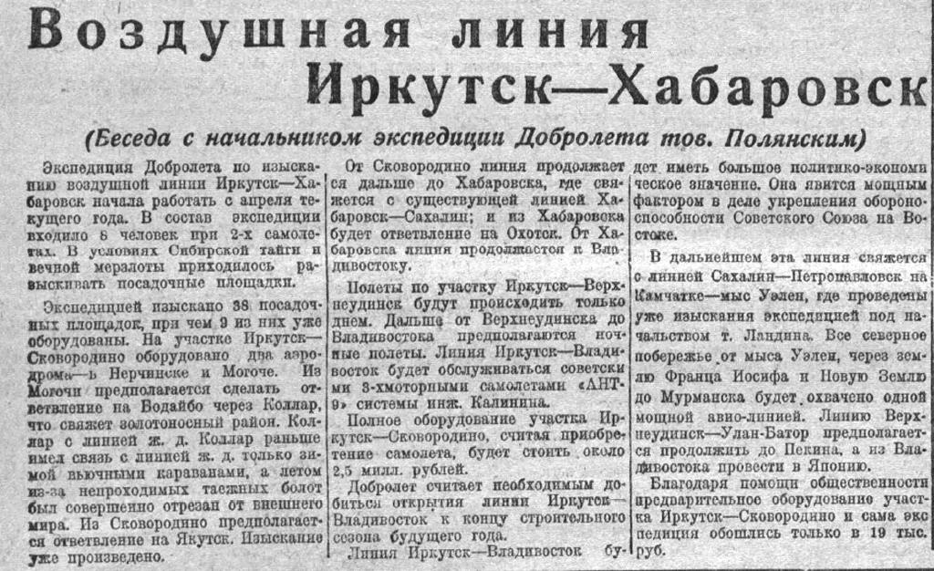54. Докладная записка правления «Добролет» по эксплуатационной работе общества «Добролет» в 1929 г. (Восточная Сибирь: эксплуатировались воздушные линии Верхнеудинск - Улан-Батор - 540 км., Иркутск - Якутск - 2706 км с ответвлением Витим - Бодайбо - 288 км. Линии открытые в 1929 г. с мая 1929 г., почтовая линия Москва - Иркутск 4700 км., характеристика работы воздушных линий. Новые виды самолетов: «Юнкерс» В-33 на линии Иркутск - Якутск и Бодайбо Фоккер С-IV на почтовой линии Москва - Иркутск.). Копия. I квартал 1930 г. ф. 9577, оп. 1, д. 158, лл. 4 - 15.