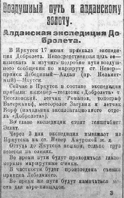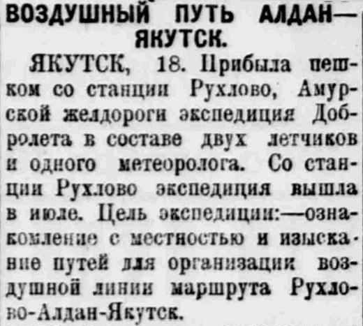 7. Докладная записка исследователя трассы для воздушной линии Алдан-Якутск в правление общества «Добролет». (Подробное описание поисков трассы - художественное описание Якутии, перспективы авиастроительства, описание аэродрома Незаметный). Подлинник. август - сентябрь 1925 г. ф. 9577, оп. 1, д. 89, лл. 42 - 47об.