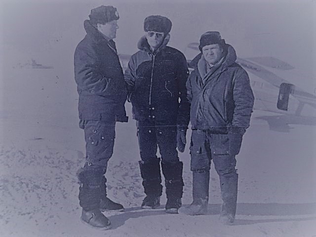 Экипаж МИ-4 слева направо 2.п.Валерий Новгородцев, б.м Георгий Балашов , квс. Александр Ткаченко , пос. Белая Гора. Якутия. зима 1977г.