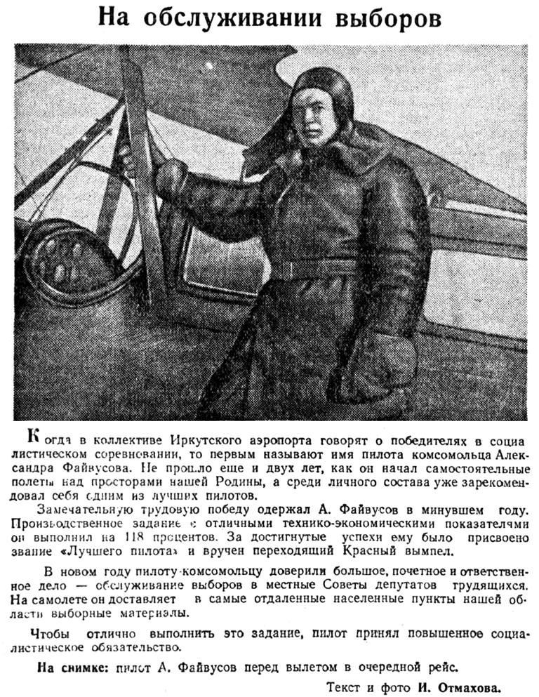 Когда в коллективе Иркутского аэропорта говорят о победителях в социалистическом соревновании, то первым называют имя пилота комсомольца Александра Файвусова. Не прошло еще и двух лет, как он начал самостоятельные полеты над просторами нашей Родины, а среди личного состава уже зарекомендовал себя одним из лучших пилотов.