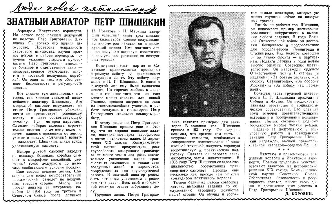 Недавно за долголетнюю и безупречную работу в гражданской авиации Петр Григорьевич Шишикин награжден, высшей правительственной наградой — орденом Ленина.