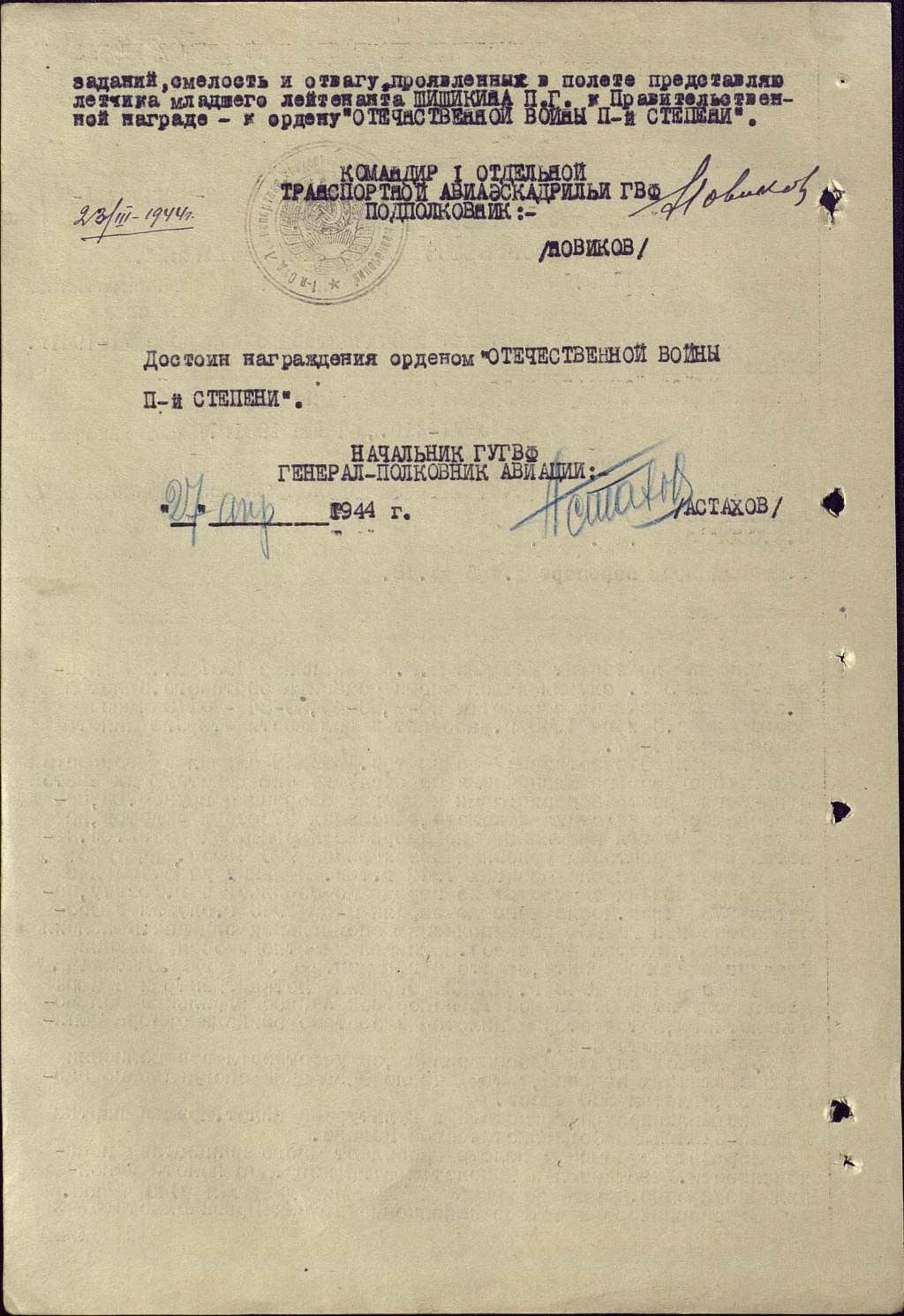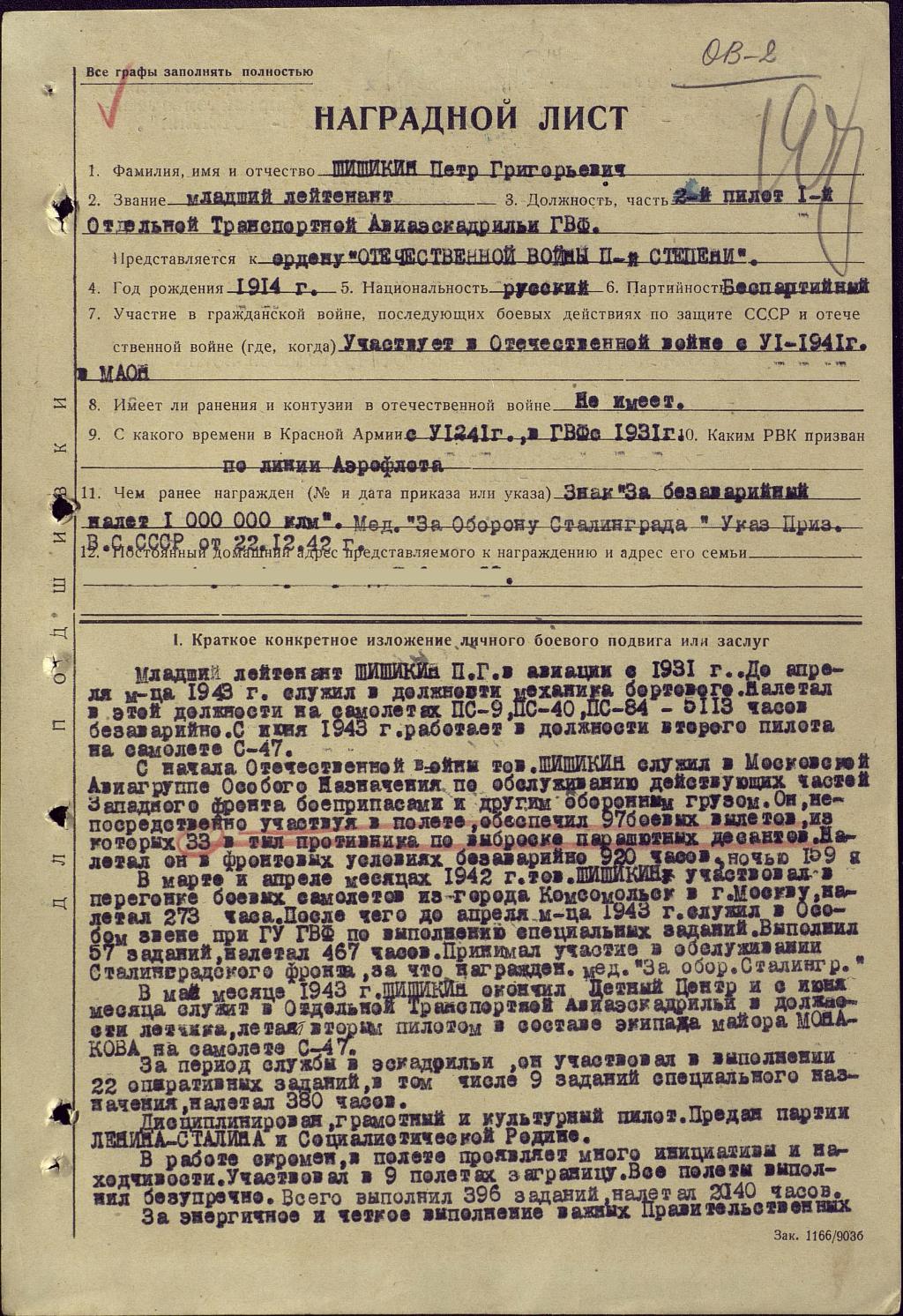 Где бы ни работал тов. Шишикин, он показывает пример дисциплинированности, аккуратности в выполнении любого задания. В годы Великой Отечественной войны он доставлял боеприпасы и продовольствие для городов-героев Ленинграда и Сталинграда. Ряд полетов совершил он за линию фронта — к партизанам. Подвиги летчика в годы войты высоко оценены Советским правительством. Он награжден орденом Отечественной войны II степени и медалями: «За боевые заслуги», «За оборону Сталинграда», «За оборону Москвы» и «За победу над Германией».