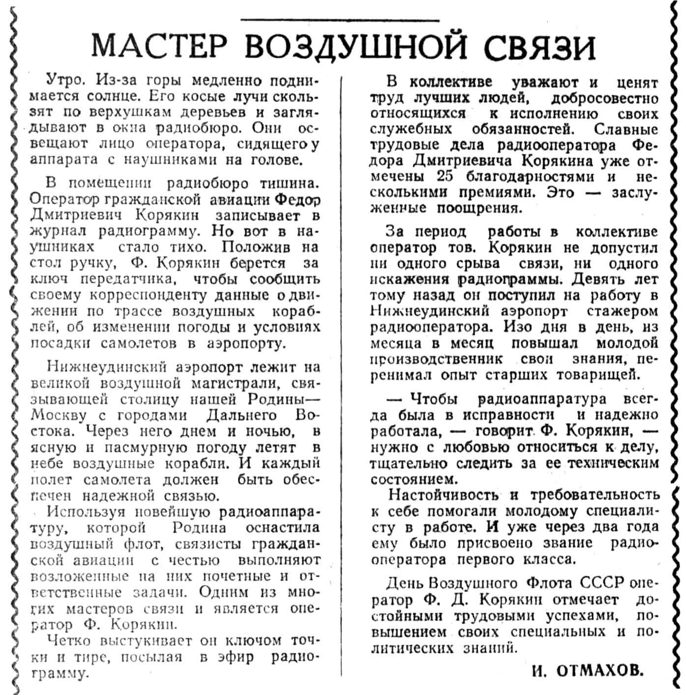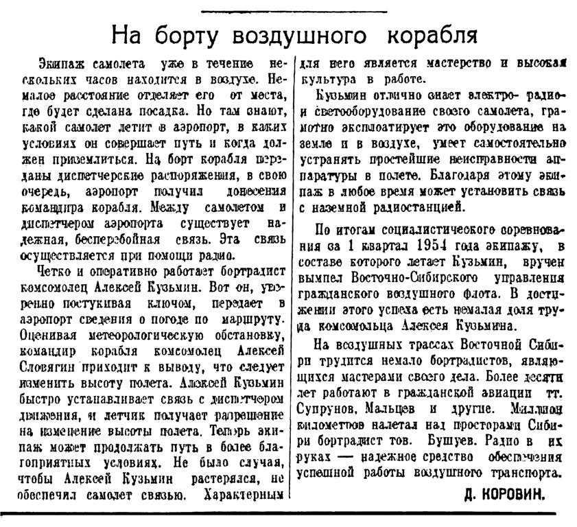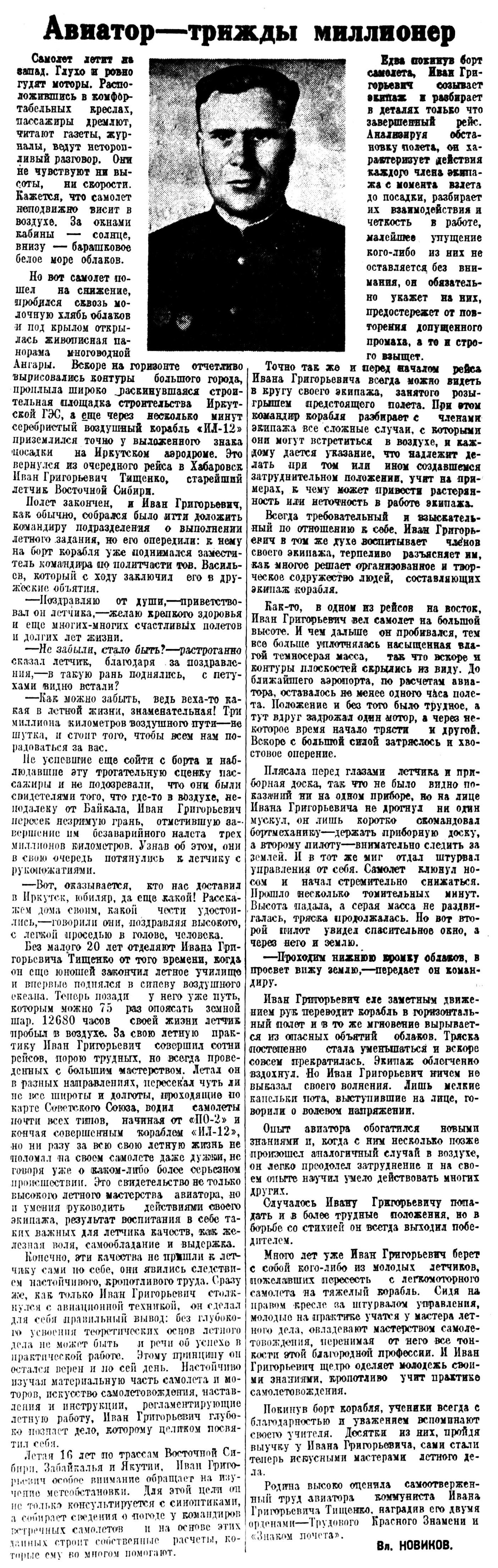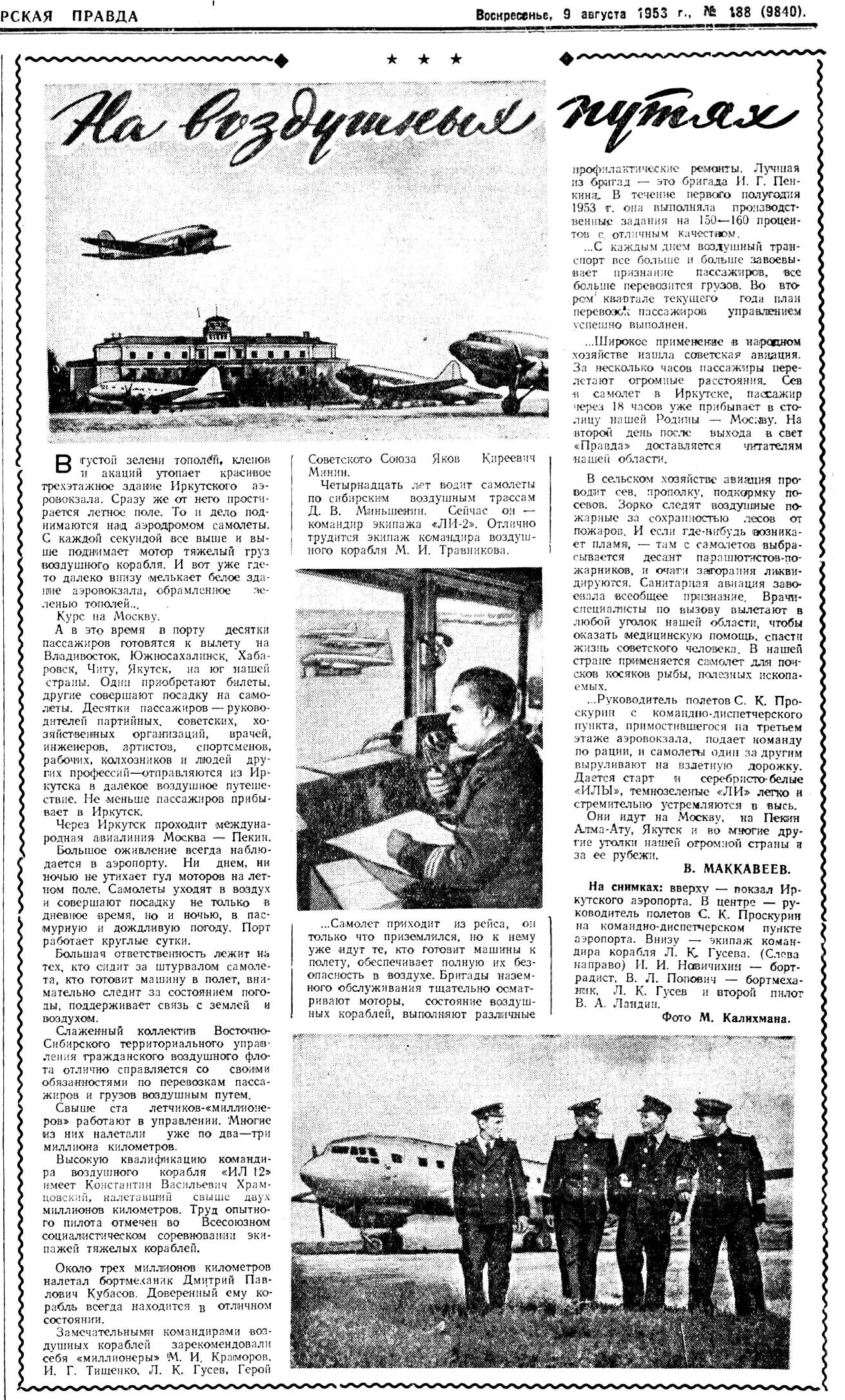 С наилучшими показателями по итогам соревнования в празднику воздушного флота пришли летчики тт. Козлов, Тищенко, Травников, Брянчуков, Гриневич, Шипов, Кузичев, Козлов, Семенов. Но отстают от этих пилотов я дважды миллионеры борт-механики С. Б. Будаков, В. К. Мельников, бортрадисты Н. П. Яковлев, А. Г. Тимченко, Н. В. Курбатов и многие другие.