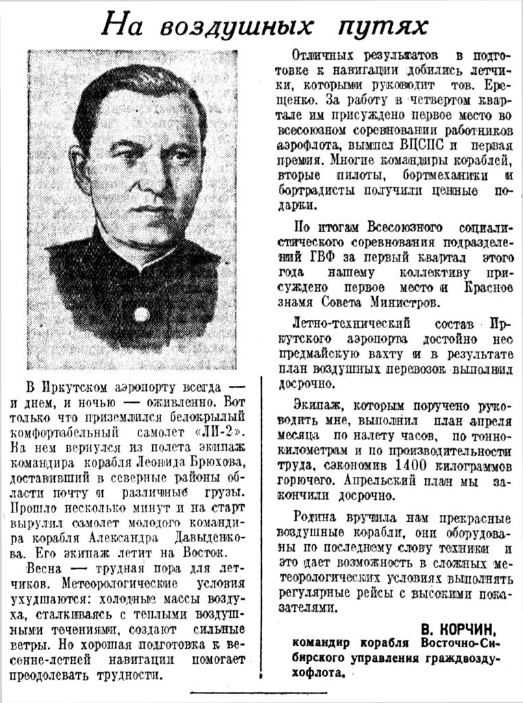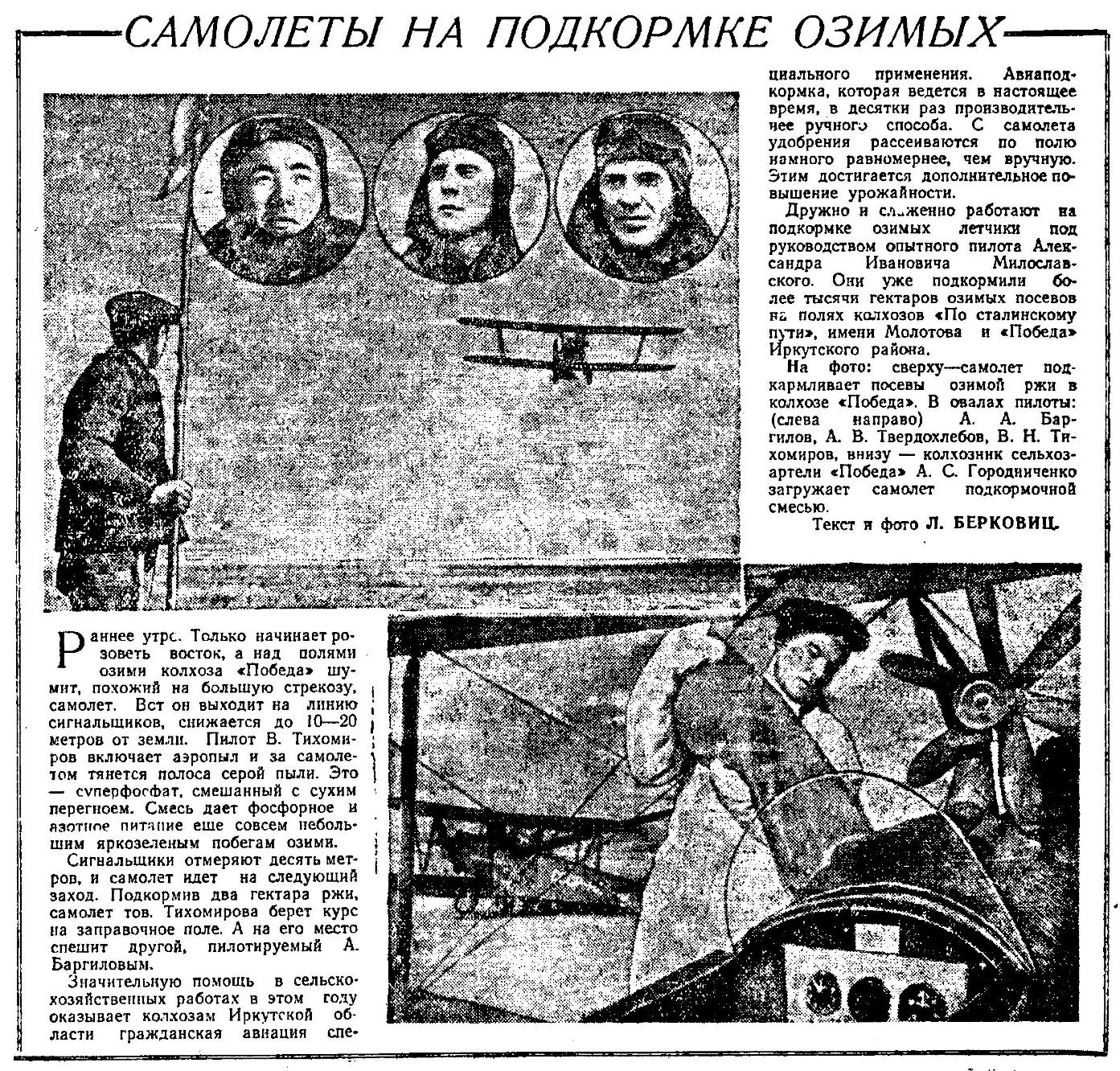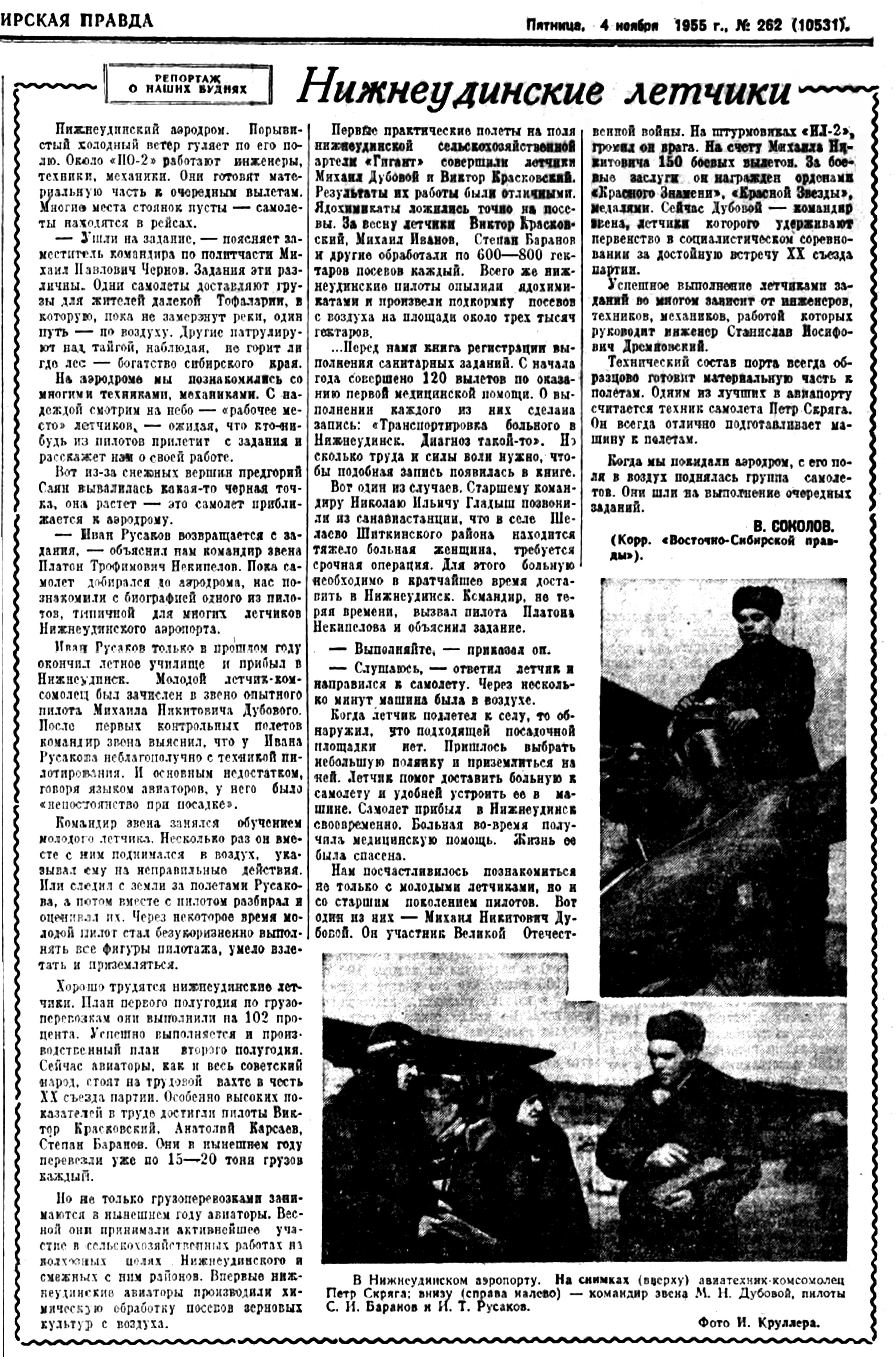 Хороших показателей в соревновании добился коллектив, которым руководит знатный авиатор Восточной Сибири, депутат Иркутского городского Совета Федор Ильич Яйлов. По условиям Всесоюзного социалистического соревнования ему присуждена третья Всесоюзная премия.
