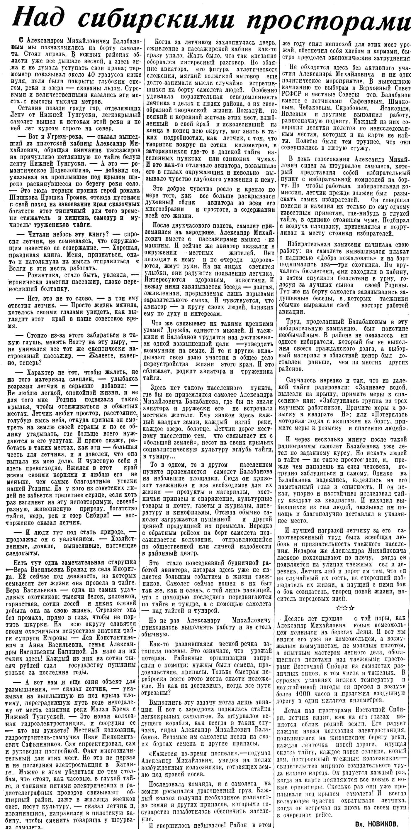 В новом году пилоту комсомольцу доверили большое, почетное и ответственное дело — обслуживание выборов в местные Советы депутатов трудящихся. На самолете он доставляет в самые отдаленные населенные пункты нашей области выборные материалы.