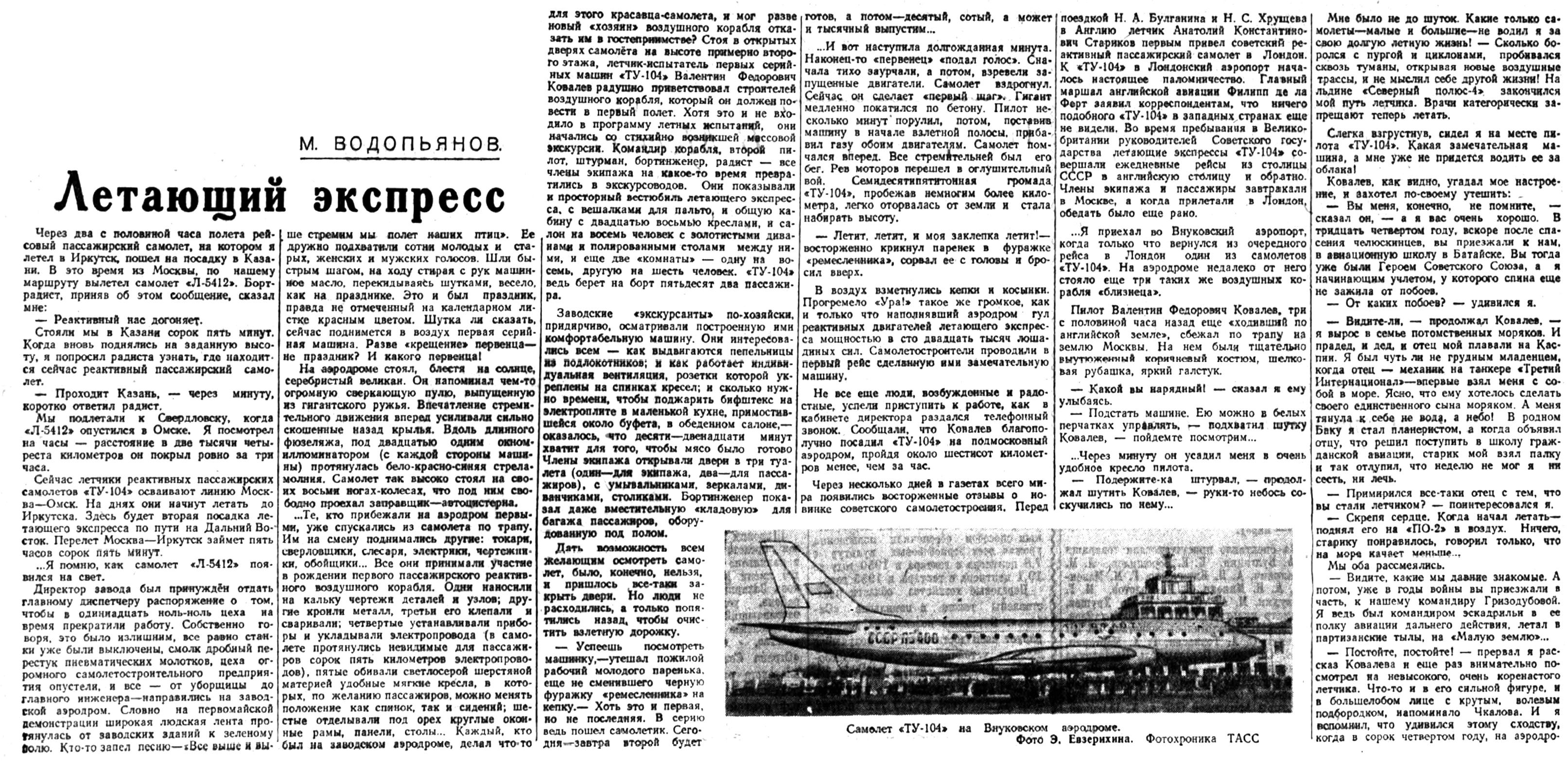 «ТУ-104» — первая советская реактивная пассажирская «ласточка». За ней последуют другие. Во время пребывания Н. А. Булганина и Н. С. Хрущева в Англии весной 1956 года их сопровождал и академик А. Н. Туполев. На одном из приемов Ники та Сергеевич Хрущев сказал, представляя гостям Туполева, о том, что советский конструктор создает сейчас пассажирский самолет на 172 пассажира. Это будет воздушный сверхгигант, с очень большой скоростью.