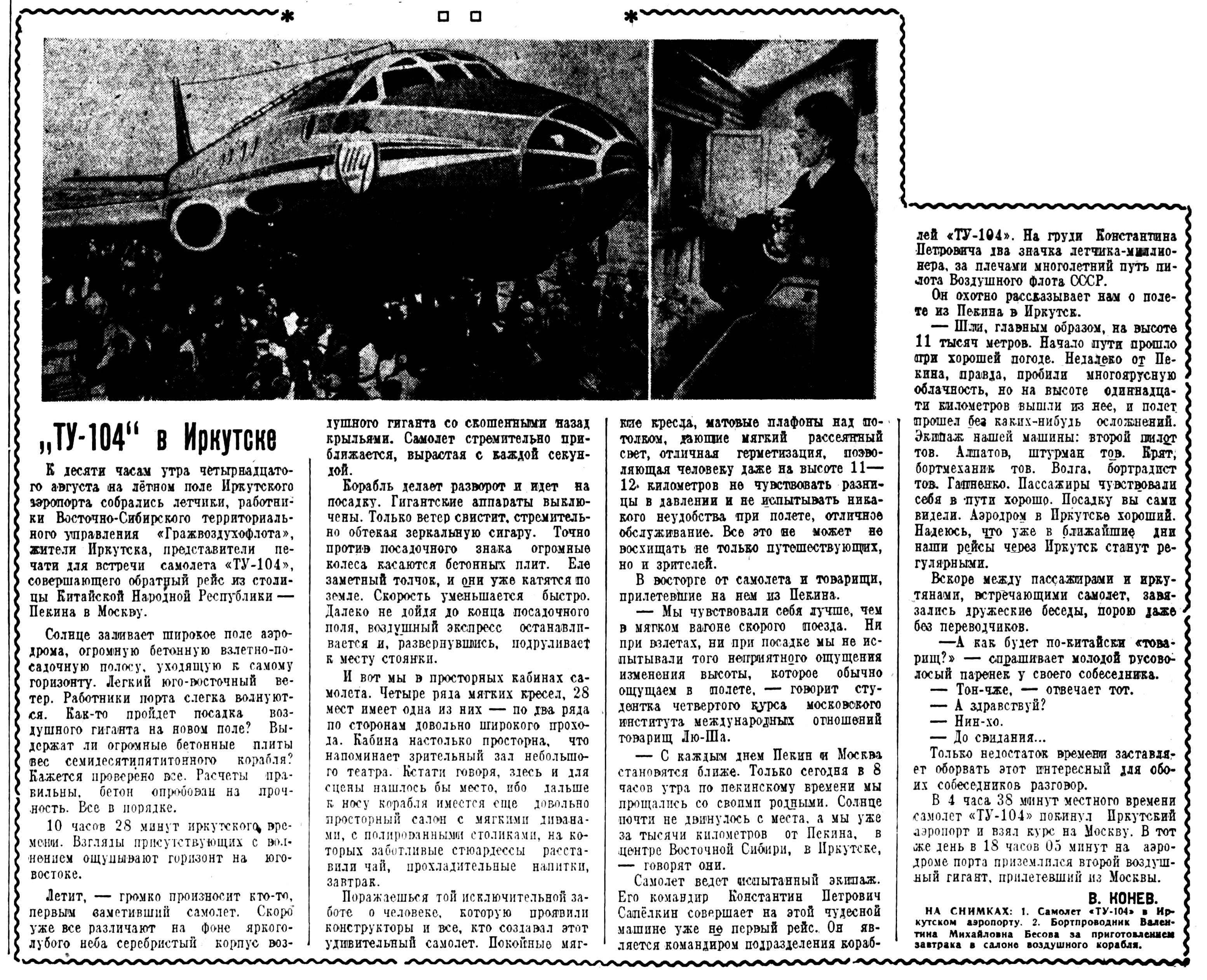К десяти часам утра четырнадцатого августа на лётном поле Иркутского аэропорта собрались летчики, работники Восточно-Сибирского территориального управления «Гражвоздухофлота», жители Иркутска, представители печати для встречи самолета «ТУ-104», совершающего обратный рейс из столицы Китайской Народной Республики — Пекина в Москву.