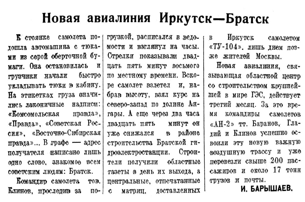 Точно по расписанию над аэродромом появляется серебристый воздушный корабль «ИЛ-14». Он плавно делает круг над летным полем и стремительно под углом идет на посадку, совершая ее так, что пассажиры не ощущают момента приземления. Самолет подрулил к перрону аэровокзала. Асфальтированная дорожка, окаймленная с обеих сторон зеленью тополей, ведет через сквер к светлому зданию, на фронтоне которого гордо красуется Государственный герб Советского Союза, а ниже надпись: Иркутск. Пассажиры из Южно-Сахалинска пролетели тысячи километров воздушного пути, и под ногами у них земля Иркутска.