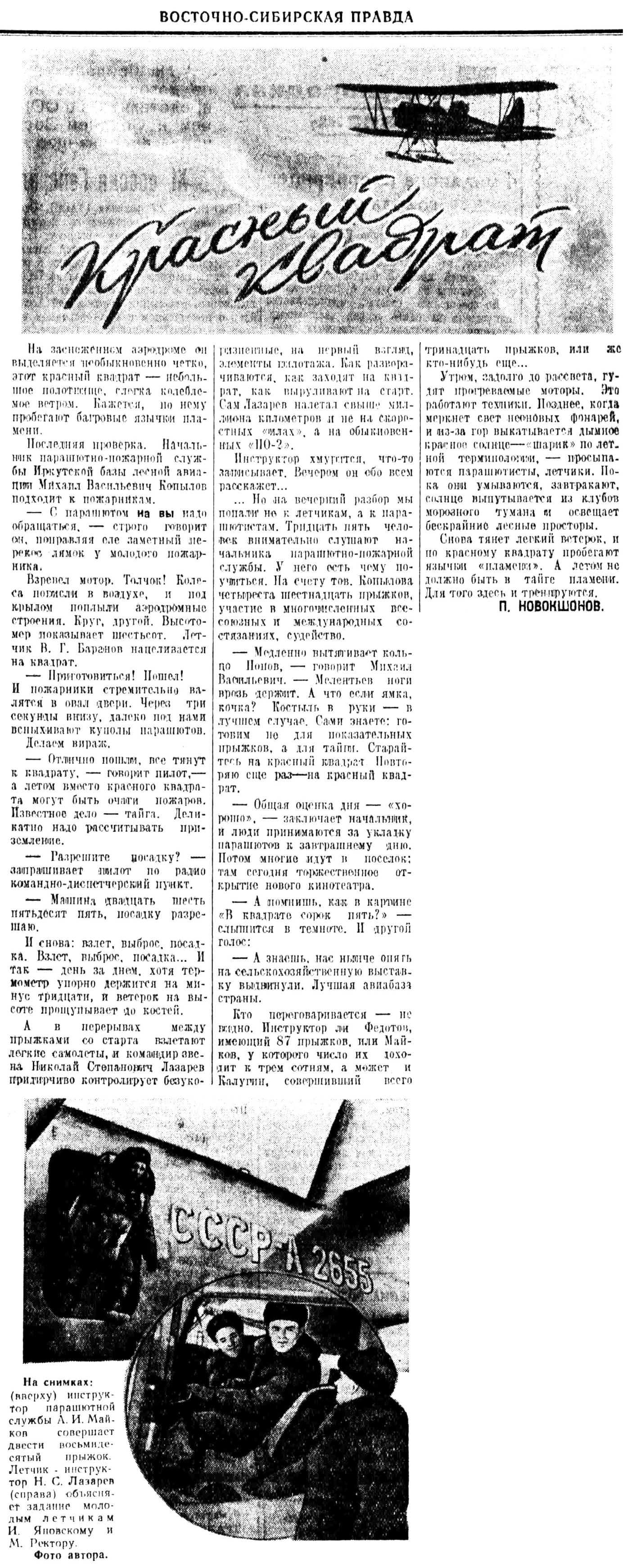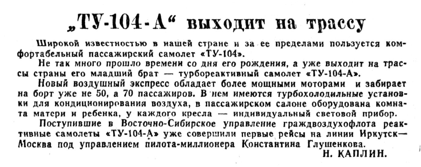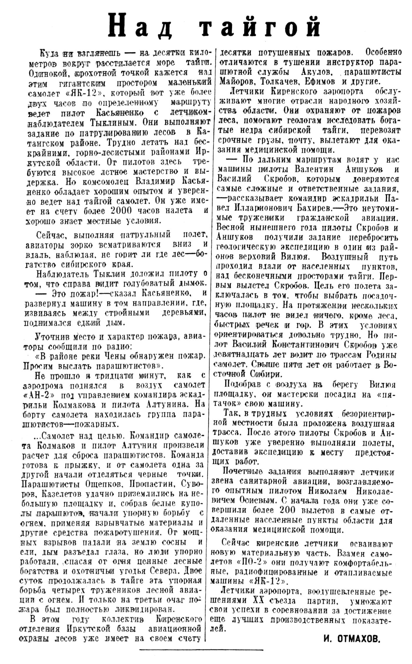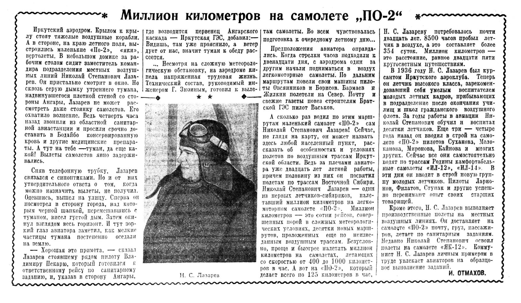 Много замечательного можно услышать о трудовых делах авиаторов-миллионеров Восточной Сибири — В. Я. Филимонова, И. Г. Тищенко, Ф. И. Яйлова, М. И. Крамарова, П. А. Горелика, Ю. Л. Анфисова и многих других.