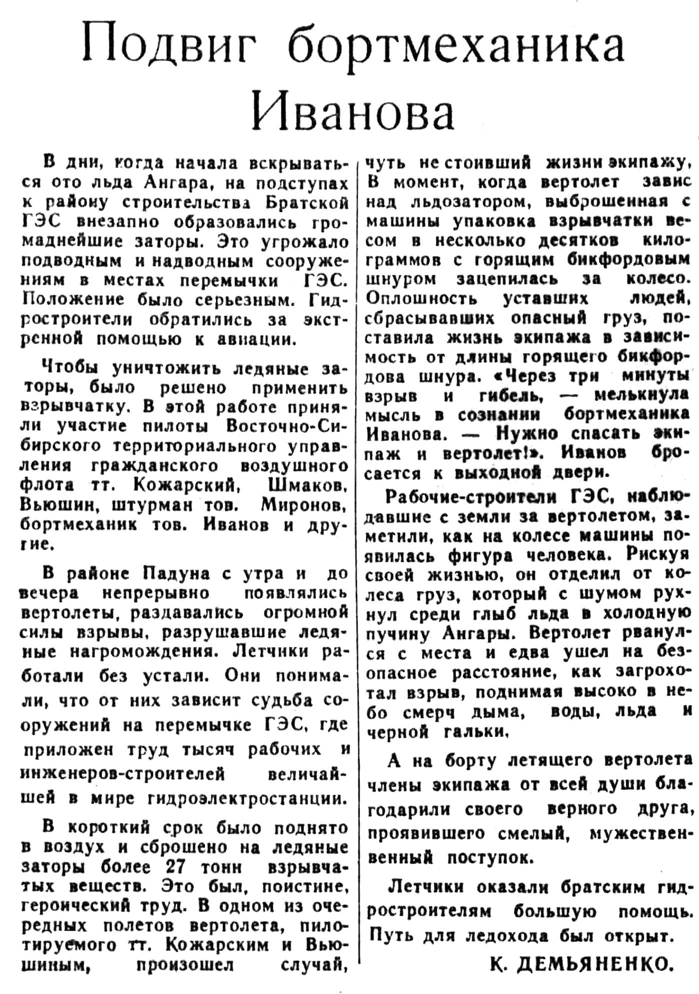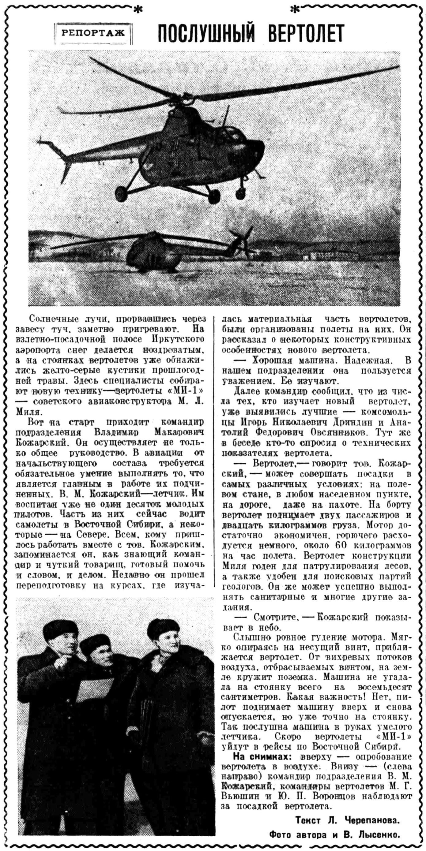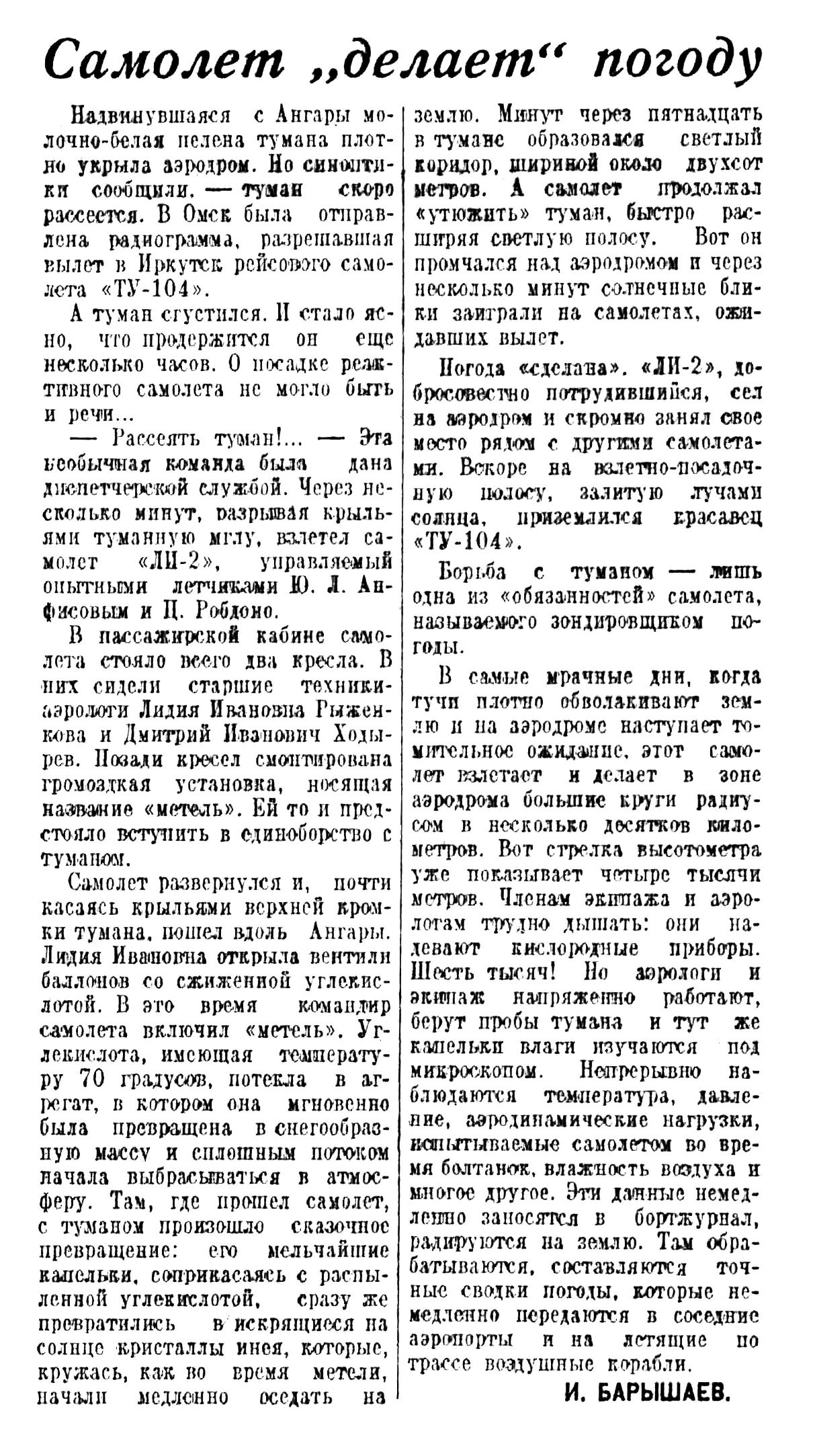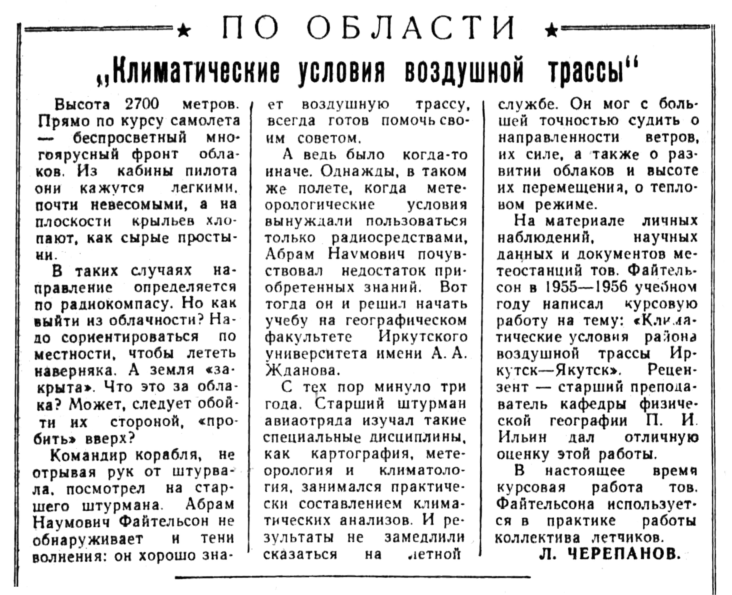 Много замечательного можно услышать о трудовых делах авиаторов-миллионеров Восточной Сибири — В. Я. Филимонова, И. Г. Тищенко, Ф. И. Яйлова, М. И. Крамарова, П. А. Горелика, Ю. Л. Анфисова и многих других.