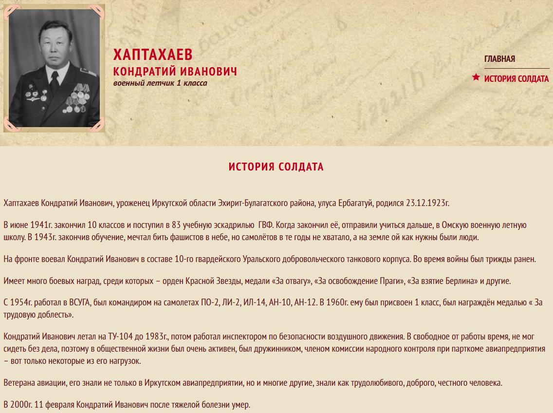 День ото дня множатся ряды авиаторов-миллионеров Восточно-Сибирского территориального управления ГВФ. Наряду со старыми мастерами летного дела быстро растут молодые кадры летчиков, налетавших по миллиону и более километров на северных трассах. Большой популярностью среди молодых летчиков пользуется командир корабля К. И. Хаптахаев (подразделение тов. Блинова). Свыше пяти тысяч часов уже пробыл он в воздухе. Слаженно и четко работает его экипаж. Во всесоюзном социалистическом соревновании он неоднократно выходил на передовые места и его хорошая работа неоднократно отмечалась в приказах начальника Главного управления ГВФ.