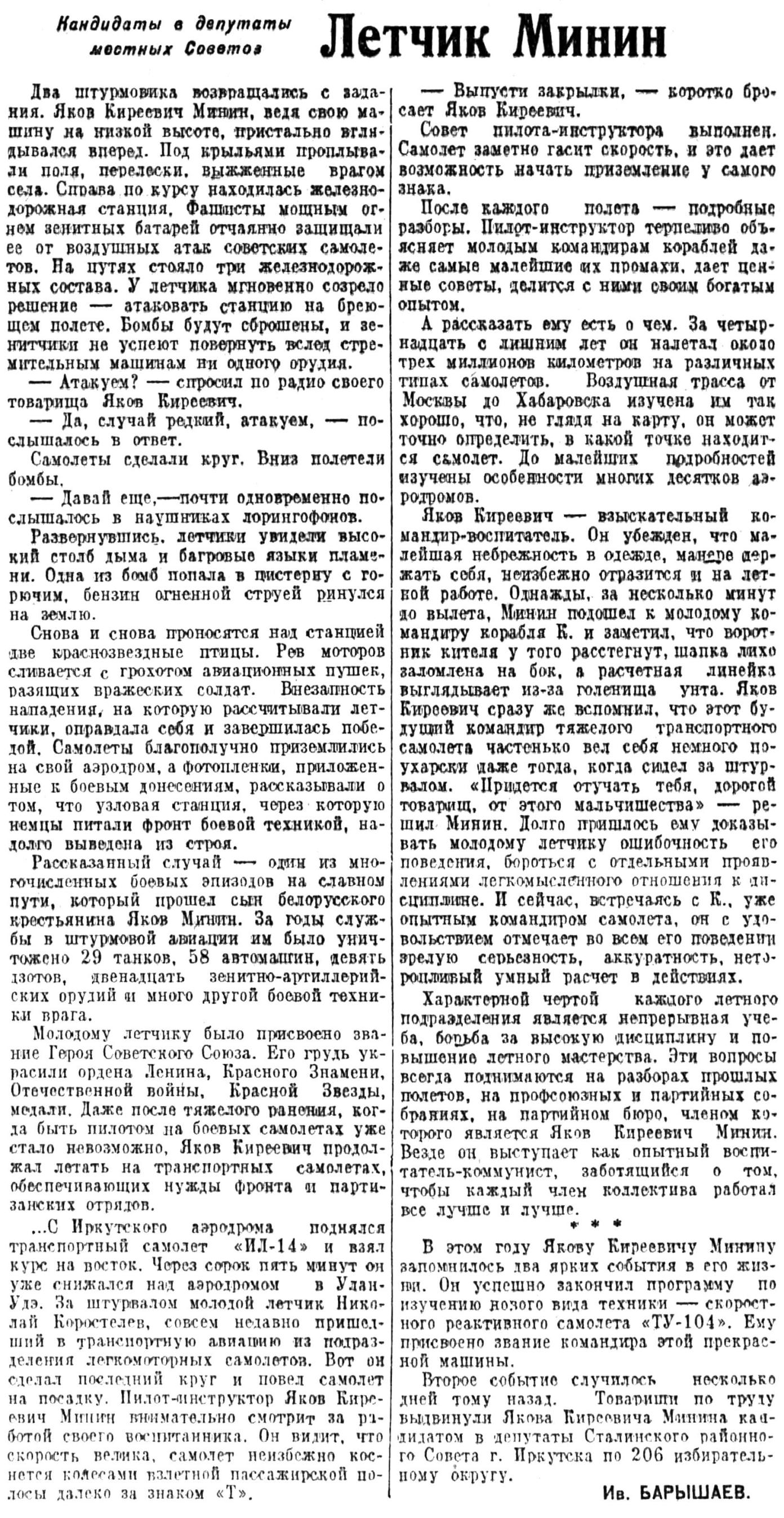 Большая и яркая авиационная биография у Якова Киреевича Минина. Его имя известно далеко за пределами Восточной Сибири. У Якова Киреевича широкие планы, большие перспективы. Будучи командиром корабля, он проявил себя незаурядным педагогом при обучении стажеров, и вот уже год как стал пилотом-инструктором. С увлечением выращивает он молодые летные кадры, передает им свой богатый опыт. Но обучая других, Яков Киреевич не перестает совершенствоваться и сам в летном мастерстве, достигнутым он не довольствуется и уже недалек день, когда он пересядет за штурвал реактивного самолета.