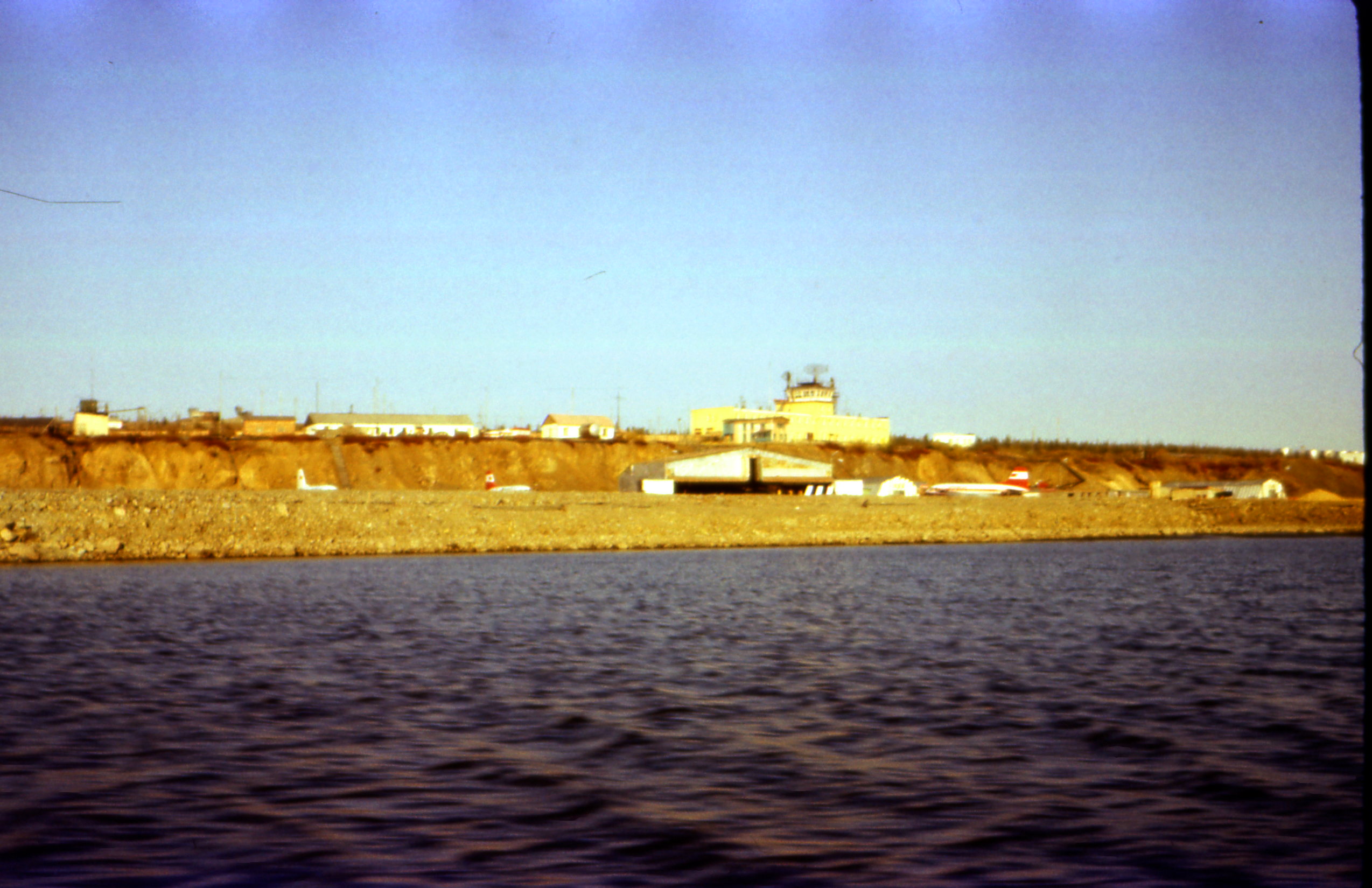 На крутом берегу здание РЭМ (левее и подальше него - футбольное поле), далее - здание группы расшифровки самописцев, старый и новый КДП, резервная дизельная КДП и котельная.