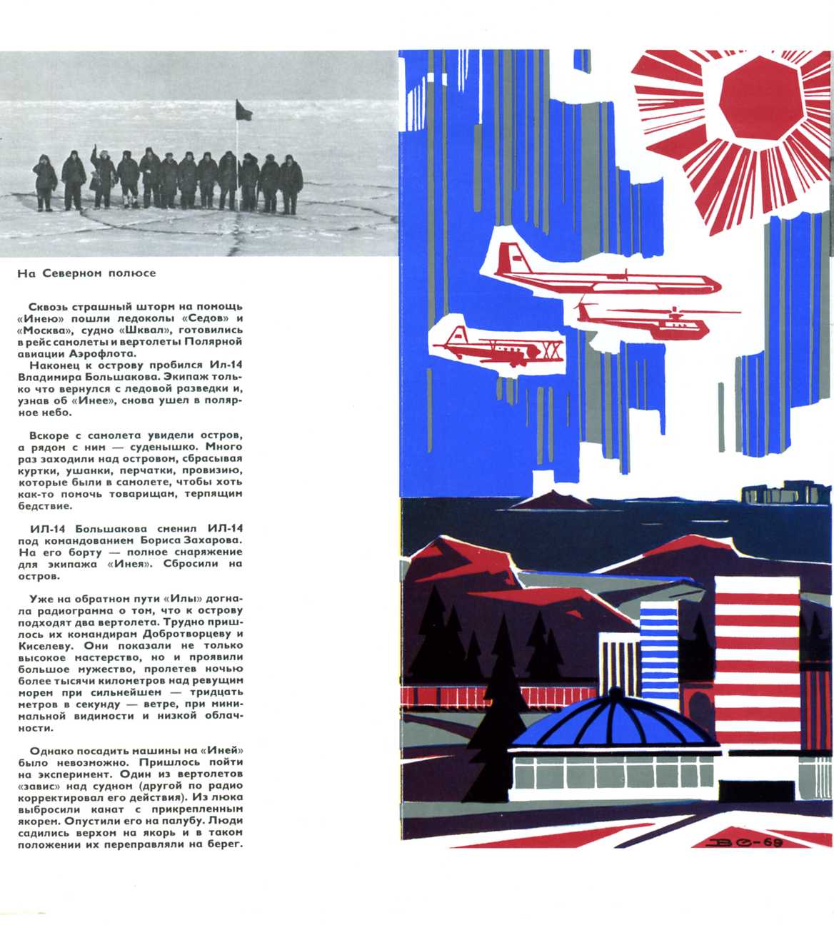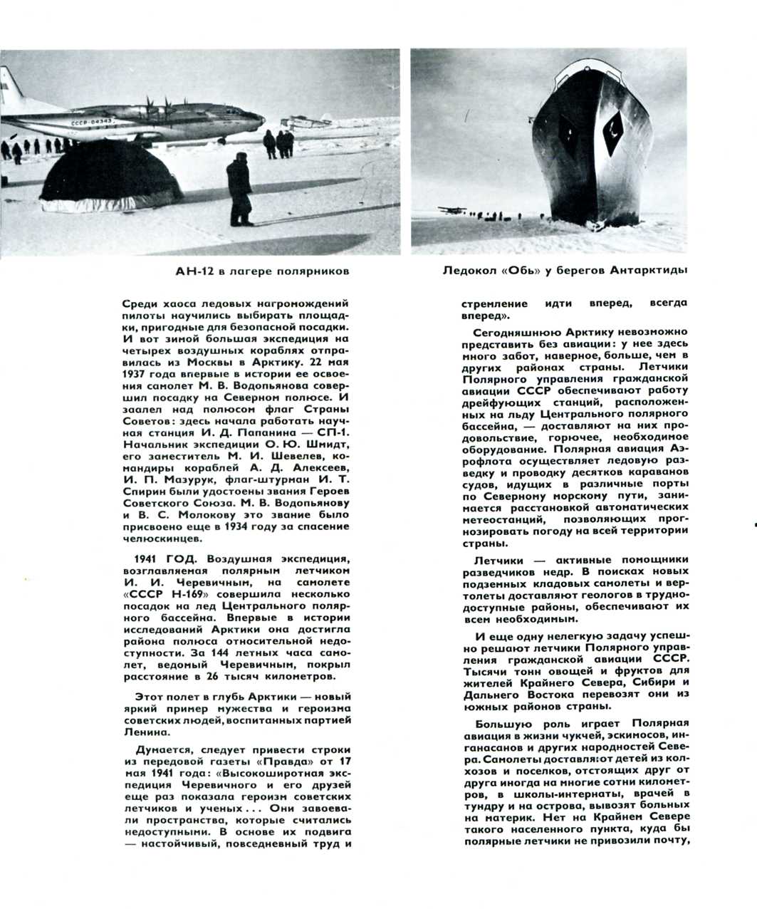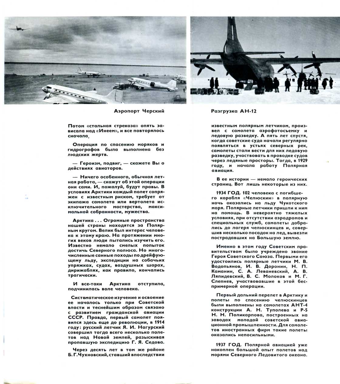 Неузнаваено изменилось Заполярье за время, прошедшее с октября 1917 года. Здесь выросло много благоустроенных городов и населенных пунктов. Прошлое, настоящее и будущее Норильска и Певека, Тикси и Анадыря, Диксона и Магадана, как и многих других городов и поселков, связано с Полярной авиацией Аэрофлота. Сейчас за Полярным кругом проложены десятки воздушных дорог. Заполярье связано с Москвой и рядом других крупных промышленных и культурных центров Советского Союза прямым воздушным сообщением. Северная воздушная магистраль  — одна из наиболее протяженных в мире  — соединяет Норильск, Магадан, Тикси, Черский и Анадырь со столицей нашей Родины. Быстроходный комфортабельный ИЛ-18 в считанные часы доставит Вас из Москвы в любой из этих населенных пунктов.