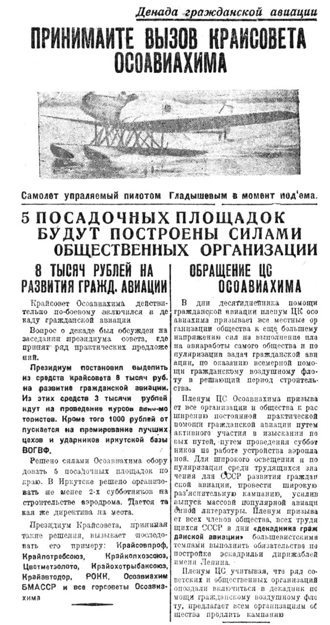 Решено силами Осоавиахима оборудовать 5 посадочных площадок по краю. В Иркутске решено организовать не менее 2-х субботников на строительство аэродрома. Дается такая же директива на места.