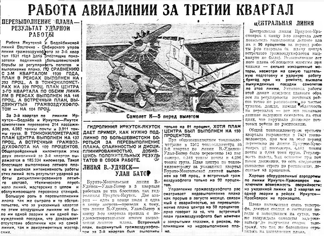 Бурято-Монгольская линия В.-Удинск — Улан-Батор в 3 квартале работала не так блестяще, как гидролиния Иркутск-Якутск. Две аварии — одна в конце июля и одна з конце августа — привели к тому, что линия В.-Удинск - Улан-Батор к концу 3-го квартала пришла с неудовлетворительным итогом выполнения летного плана. Встречный план, выдвинутый гражвоздухофлотом за 3-й квартал был выполнен только на 81 процент, ХОТЯ ПЛАН ЦЕНТРА БЫЛ ВЫПОЛНЕН НА 150 ПРОЦЕНТОВ.