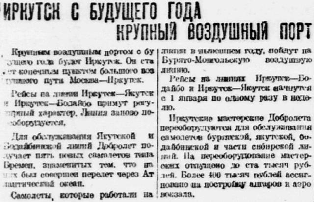 Иркутские мастерские Добролета переоборудуются для обслуживания самолетов бурятской, якутской, бодайбинской и части сибирских линий. Нa переоборудование мастерских отпущено до ста тысяч рублей. Более 400 тысяч рублей ассигновано на постройку ангаров и аэровокзала.
