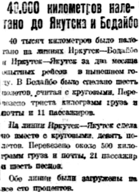 40 тысяч километров было налетано на линиях Иркутск — Бодайбо и Иркутск — Якутск за два месяца опытных рейсов в нынешнем году. В Бодайбо было сделано шесть полетов, считая с круговыми. Перевезено триста килограммов груза и почты и 11 пассажиров.