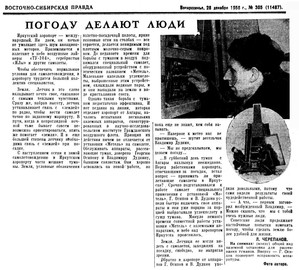 ...В субботний день туман с Ангары нахлынул неожиданно. Перед работниками аэропорта, отвечающими за посадки, встал вопрос — принимать ли прилетающие самолеты в Иркутске? Срочно подготавливался к работе самолет специального применения с установкой «Метель». Г. Осипов и В. Дудкин успели быстро включить свои аппараты и они уже порцию за порцией выбрасывали углекислоту в гущу тумана. Минуло немного времени совместной работы установки «Метель» с наземными аппаратами, и небо над аэропортом Иркутска прояснилось.