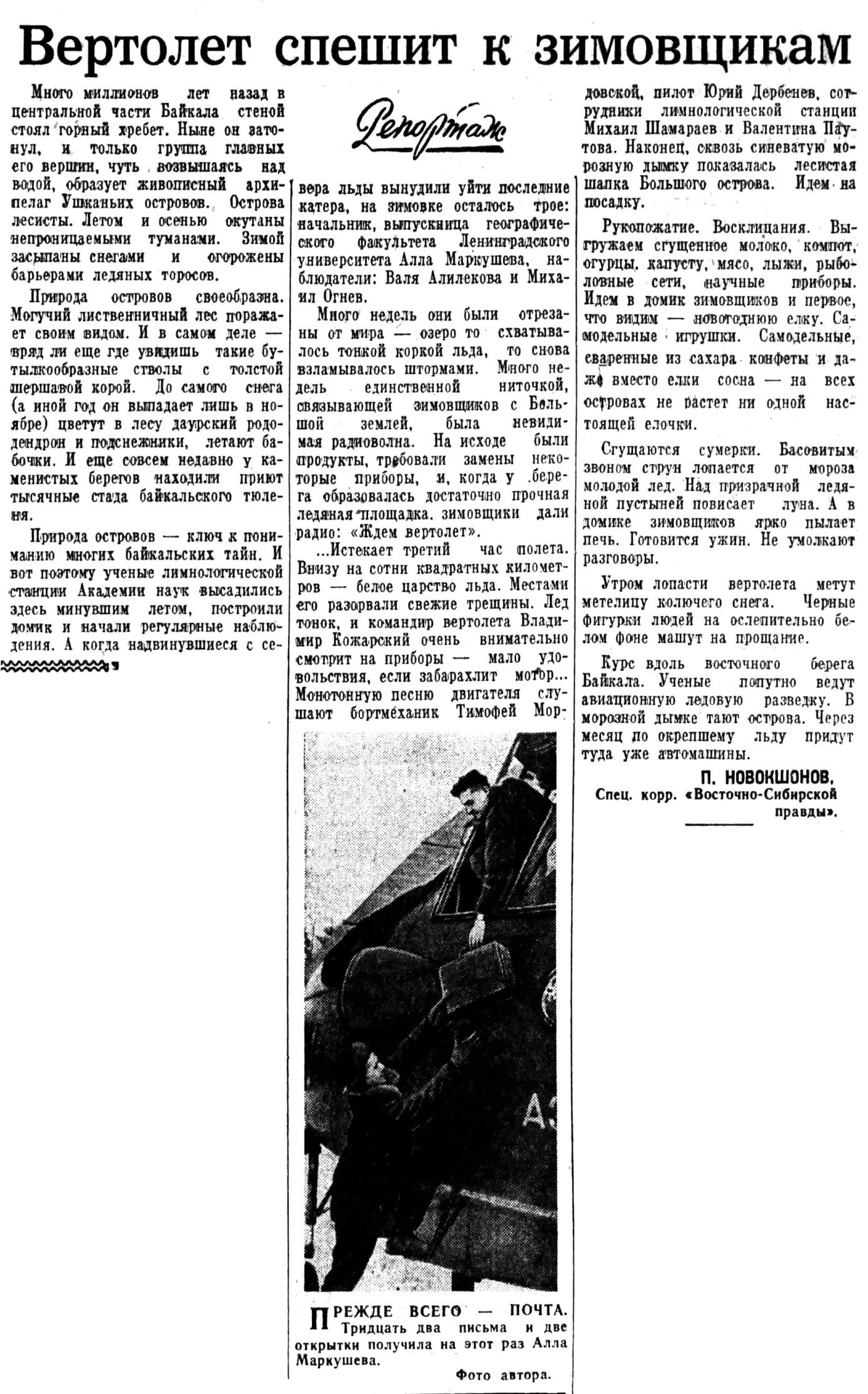 ...Истекает третий час полета. Внизу на сотни квадратных километров — белое царство льда. Местами его разорвали свежие трещины. Лед тонок, и командир вертолета Владимир Кожарский очень внимательно смотрит на приборы — мало удовольствия, если забарахлит мoтоp... Монотонную песню двигателя слушают бортмеханик Тимофей Мордовской, пилот Юрий Дербенев, сотрудники лимнологической станции Михаил Шамараев и Валентина Паутова. Наконец, сквозь синеватую морозную дымку показалась лесистая шапка Большого острова. Идем на посадку.