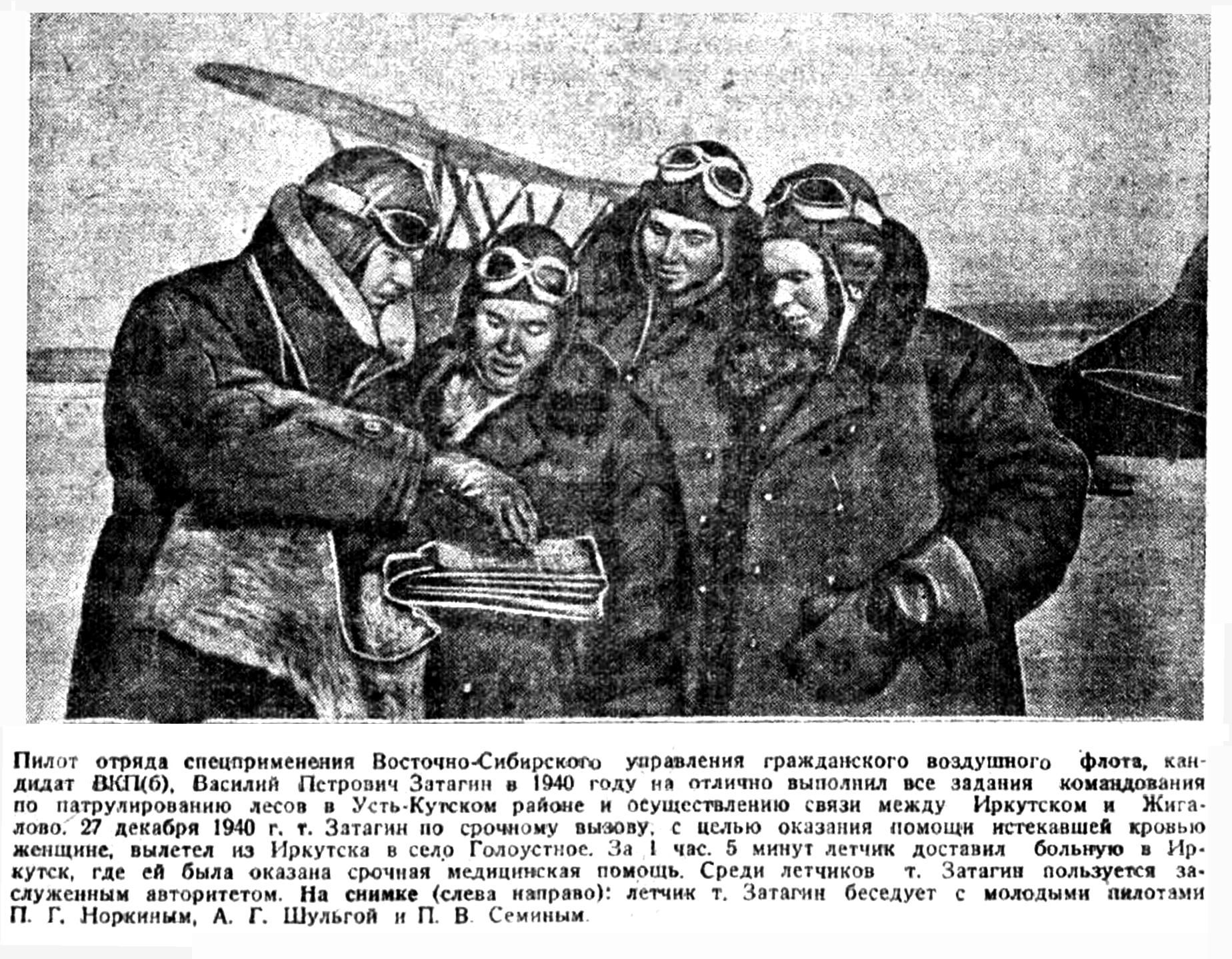 Пилот отряда спецприменения Восточно-Сибирского управления гражданского воздушного флота, кандидат ВКП(б), Василий Петрович Затагин в 1940 году на отлично выполнил все задания командования по патрулированию лесов в Усть-Кутском районе и осуществлению связи между Иркутском и Жигалово. 27 декабря 1940 г. т. Затагин по срочному вызову, с целью оказания помощи истекавшей кровью женщине, вылетел из Иркутска в село Голоустное. За 1 час. 5 минут летчик доставил больную в Иркутск, где ей была оказана срочная медицинская помощь. Среди летчиков т. Затагин пользуется заслуженным авторитетом.
