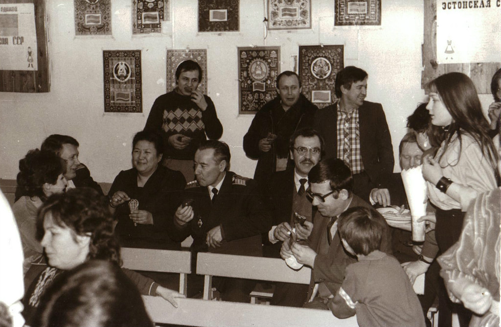 Подпись к фото:" Вот так запросто приходили гости в школу - работники ЧОАЭ и руководители района." На фото командир эскадрильи А.А. Муратов (слева) и замполит А.Д.Ковешников (в центре), КИД клуб интернациональной дружбы в школе. Отмечали праздник - 15 Союзных республик СССР.