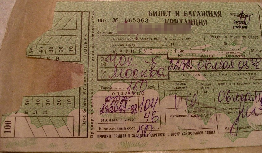 У меня тоже сохранились билеты, но в основном служебные, в которых есть и Черский и Чокурдах, Тикси, Певек, Шмидт, Якутск, Иркутск, Нефтеюганск, Сургут, Свердловск, Новосибирск, Кременчуг, Полтава, Москва, Ново-Аганск, Жиганск.