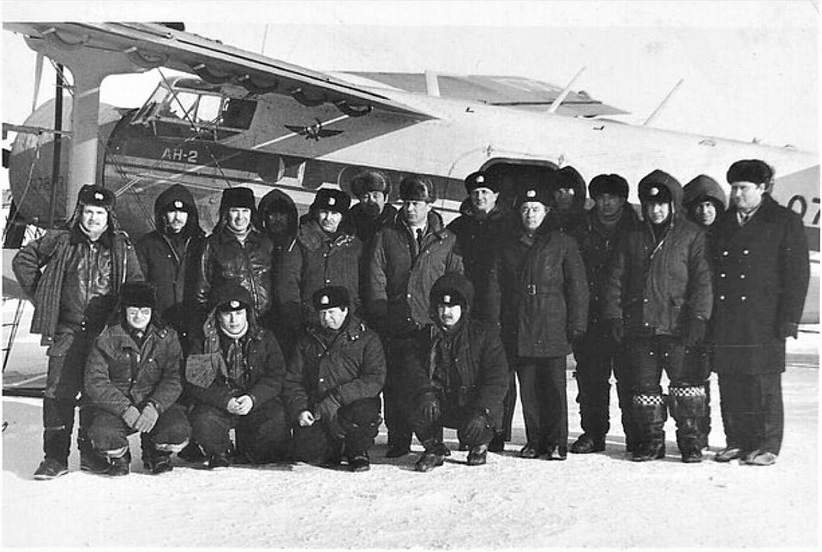 Руководство ЧОАЭ встречает прибывших из командировки на острова Жохова у самолёта Ан-2 СССР-07867.