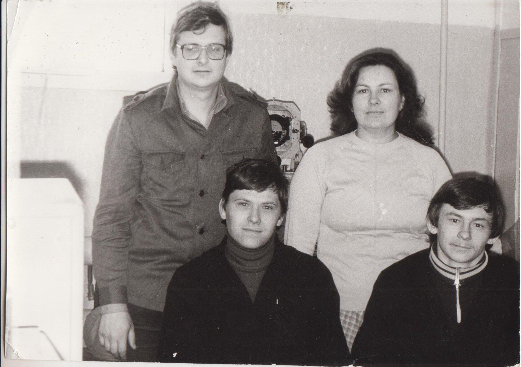 В лаборатории АиРЭО АТБ. Владимиров Александр, Клыкова Раиса, Борисов Владимир, Савченко Владимир. На заднем плане - установка УПГ-48, для проверки гироскопии.