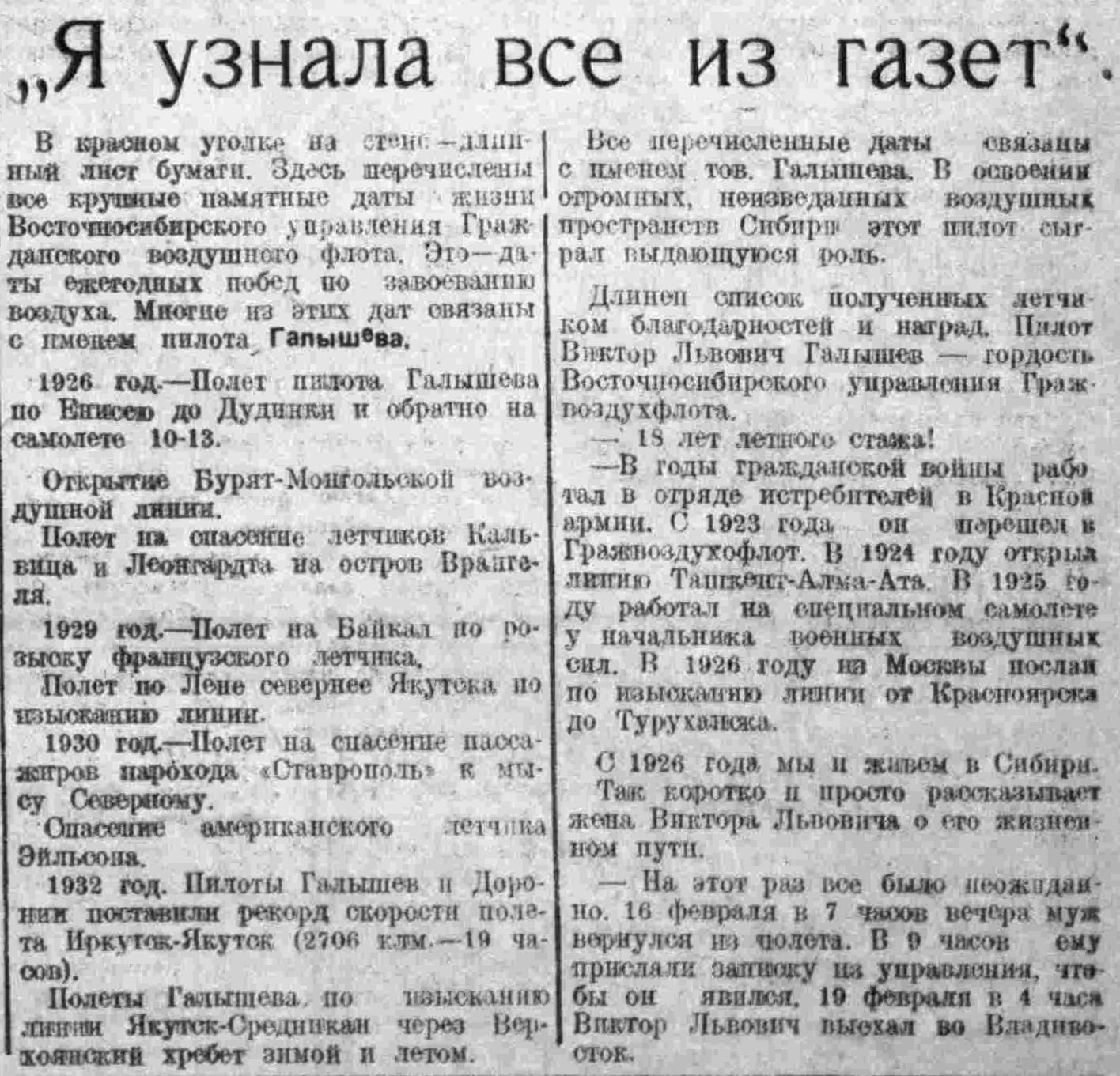 В Хабаровске нас встретил пилот Галышев. Оказалось, что парохода во Владивостоке придется ждать до 20 апреля. Наши пилоты не хотели ждать, поэтому они просили разрешения вылететь, не дожидаясь парохода. Получили телеграмму от правительственной комиссии по спасению челюскинцев — вылететь прямо из Хабаровска.