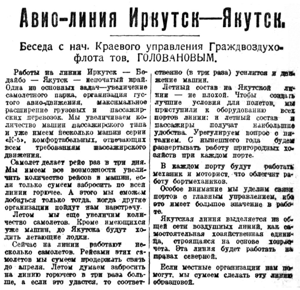 Управлением Гражвоздухофлота намечено провести большее работы по оборудованию самолетов и портов. Особое внимание уделяется линии Якутск — Бодайбо. К 1 июня на протяжении всей линии будет налажена работа радиостанций Гражвоздухофлота. Протяженность воздушных путей будет доведена до 10 тысяч километров.