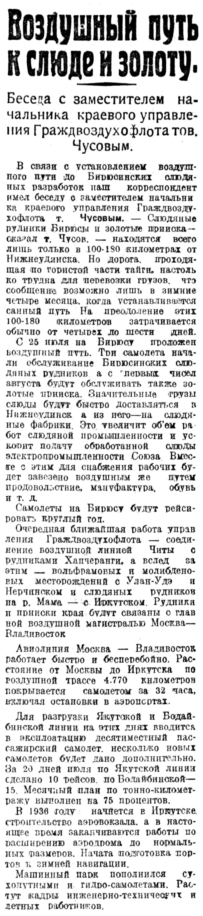 С 25 июля на Бирюсу проложен воздушный путь. Три самолета начали обслуживание Бирюсинских слюдяных рудников, а с первых чисел августа будут обслуживать также золотые прииска. Значительные грузы слюды будут быстро доставляться в Нижнеудинск а из него — на слюдяные фабрики. Это увеличит объем работ слюдяной промышленности и ускорит подачу обработанной слюды электропромышленности Союза. Вместе с этим для снабжения рабочих будет завезено воздушным же путем продовольствие, мануфактура, обувь и т. д.