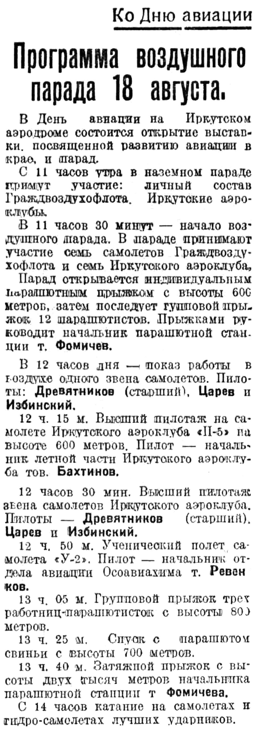 12 ч. 15 м. Высший пилотаж на самолете Иркутского аэроклуба «П-5» на высоте 600 метров. Пилот — начальник летной части Иркутского аэроклуба тов. Бахтинов.