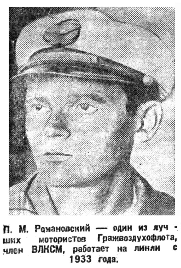 П. М. Романовский — один из лучших мотористов Гражвоздухофлота, член ВЛКСМ, работает на линии с 1933 года.