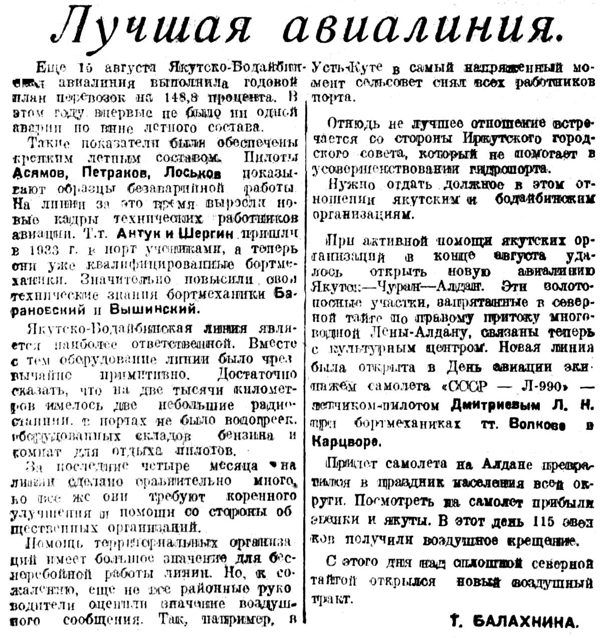 При активной помощи якутских организаций в конце августа удалось открыть новую авиалинию Якутск — Чуран — Алдан. Эти золотоносные участки, запрятанные в северной тайге по правому притоку многоводной Лены - Алдану, связаны теперь с культурным центром. Новая линия была открыта в День авиации экипажами самолета «СССР — Л-990» — летчиком-пилотом Дмитриевым Л. Н. при бортмеханиках тт. Волкове и Карцворе.