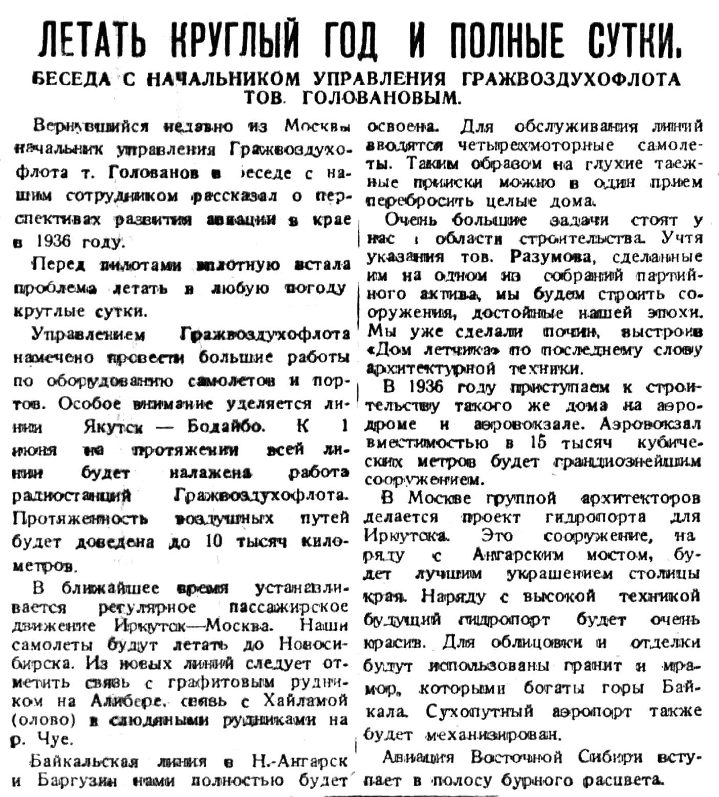 Вернувшийся недавно из Москвы начальник управления Гражвоздухофлота т. Голованов в беседе с нашим сотрудником рассказал о перспективах развития авиации в крае в 1936 году.