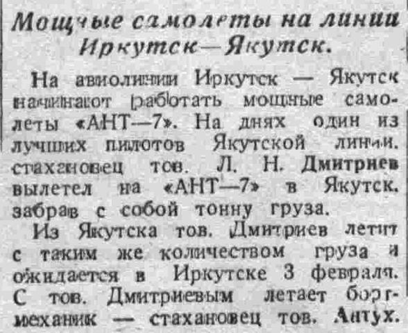 На авиолинии Иркутск — Якутск начинают работать мощные самолеты «АНТ—7». На днях один из лучших пилотов Якутской линии, стахановец тов. Л. Н. Дмитриев вылетел на «АНТ—7» в Якутск, забрав с собой тонну груза.