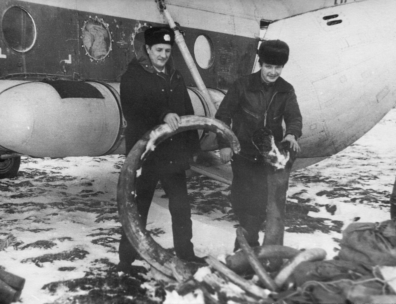 КВС А.Чумаков и б/радист А.Кузьмин осматривают груз - бивень мамонта.
