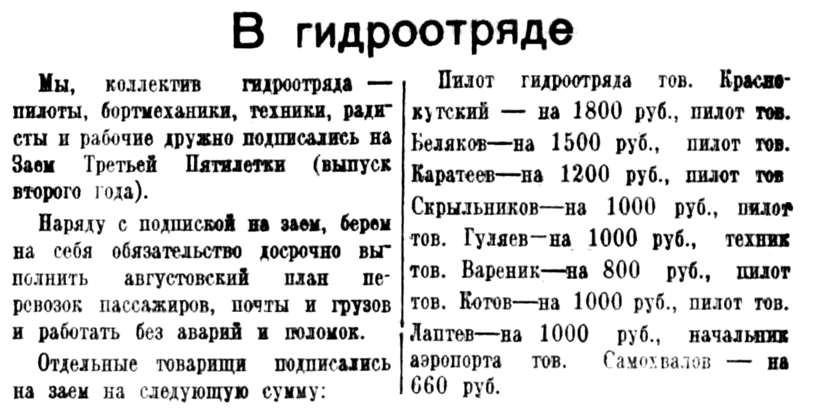 Мы, коллектив гидроотряда — пилоты, бортмеханики, техники, радисты и рабочие дружно подписались на Заем Третьей Пятилетки (выпуск второго года).