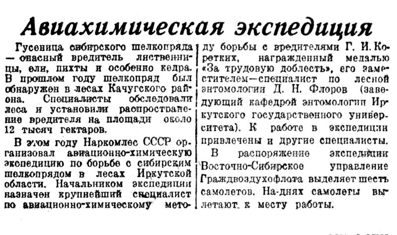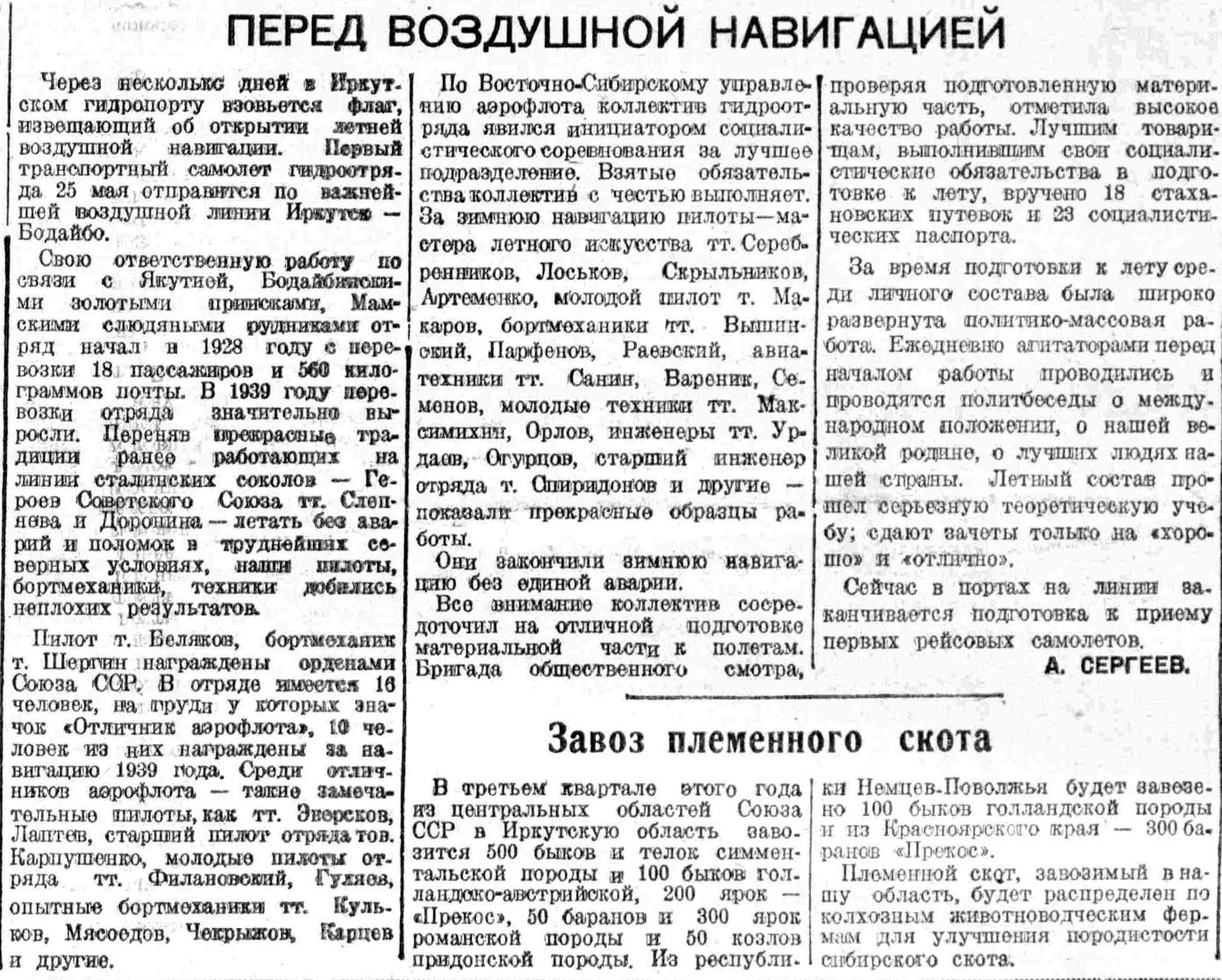 Благодаря социалистическому соревнованию имени Третьей Сталинской Пятилетки, коллектив, Восточносибирского Управления Гражданского Воздушного Флота после весеннего перерыва, точно по графику, открыл эксплоатацию авиалинии Иркутск — Якутск. 31 мая стахановский экипаж — пилот первого класса т. Краснокутский и бортмеханик т. Мясоедов — первым вылетел в авиарейс по трассе Иркутск — Якутск.
