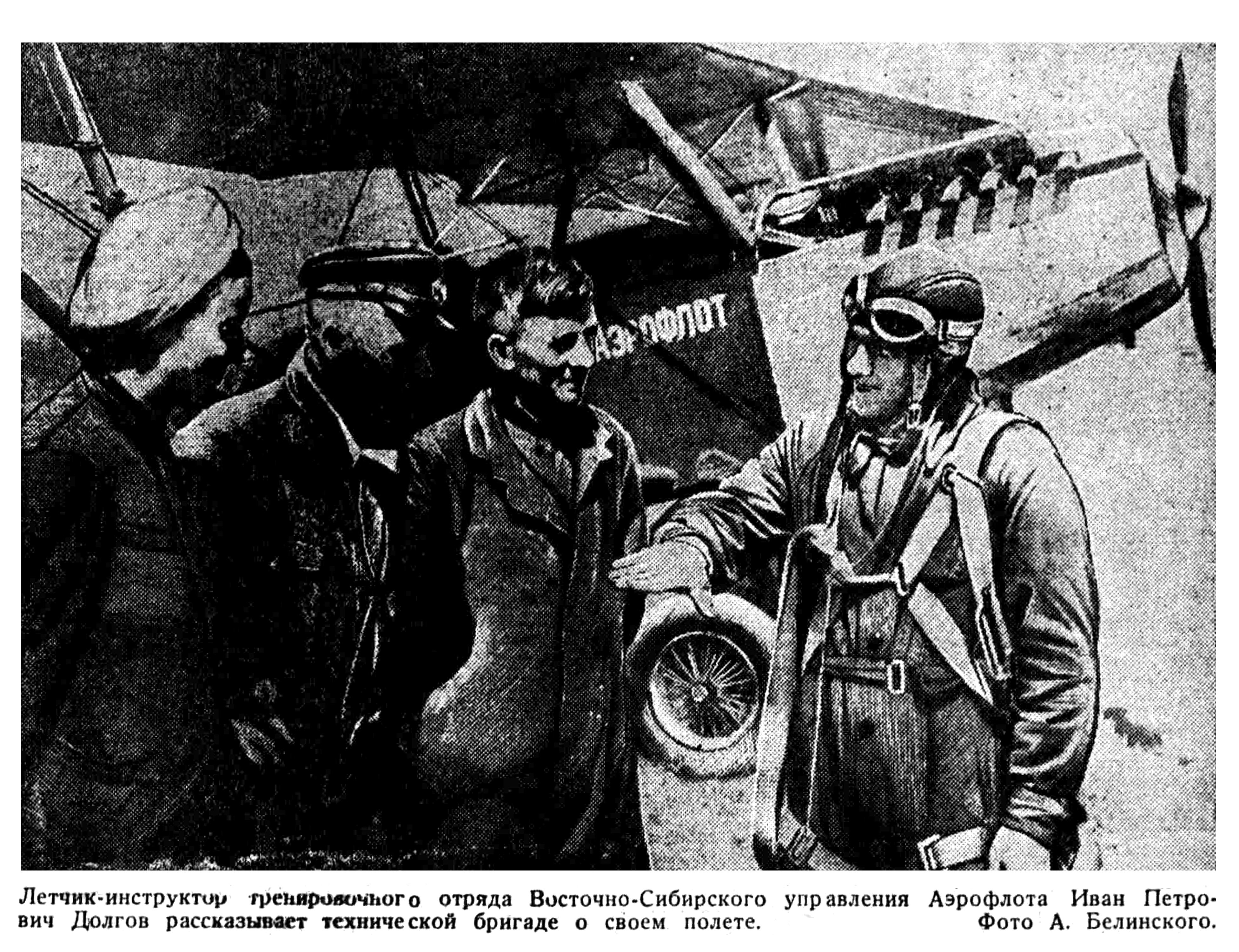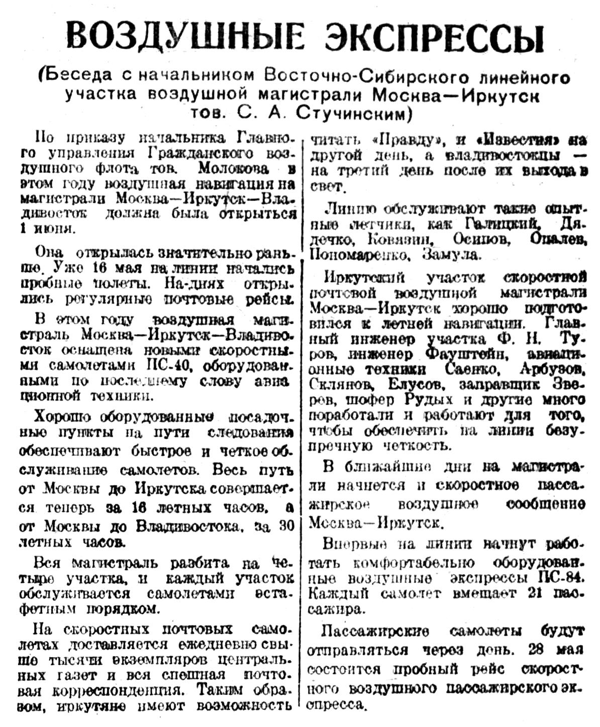 Иркутский участок скоростной почтовой воздушной магистрали Москва—Иркутск хорошо подготовился к летней навигации. Главный инженер участка Ф. Н. Туров, инженер Фауштейн, авиационные техники Саенко, Арбузов, Склянов, Елусов, заправщик Зверев, шофер Рудых и другие много поработали и работают для того, чтобы обеспечить на линии безупречную четкость.